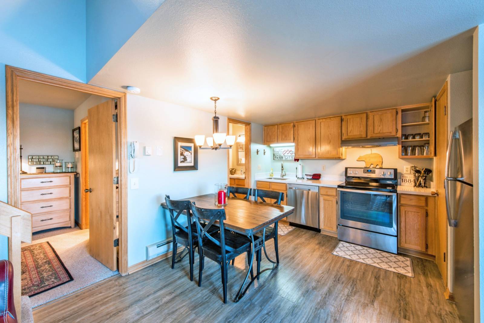 The living room flows smoothly into the kitchen and dining area. The fully equipped kitchen features various appliances, including a fridge, microwave, stove/oven, dishwasher & other small appliances. The unit is also well stocked with cookware, corning ware & flatware, making preparing every meal much more enjoyable. If you want a night out, visit Kimball Junction or downtown Park City to enjoy unique shops, local events, tasty eateries, and gourmet dining experiences. The kitchen also has a dining table that can seat four (4) people.