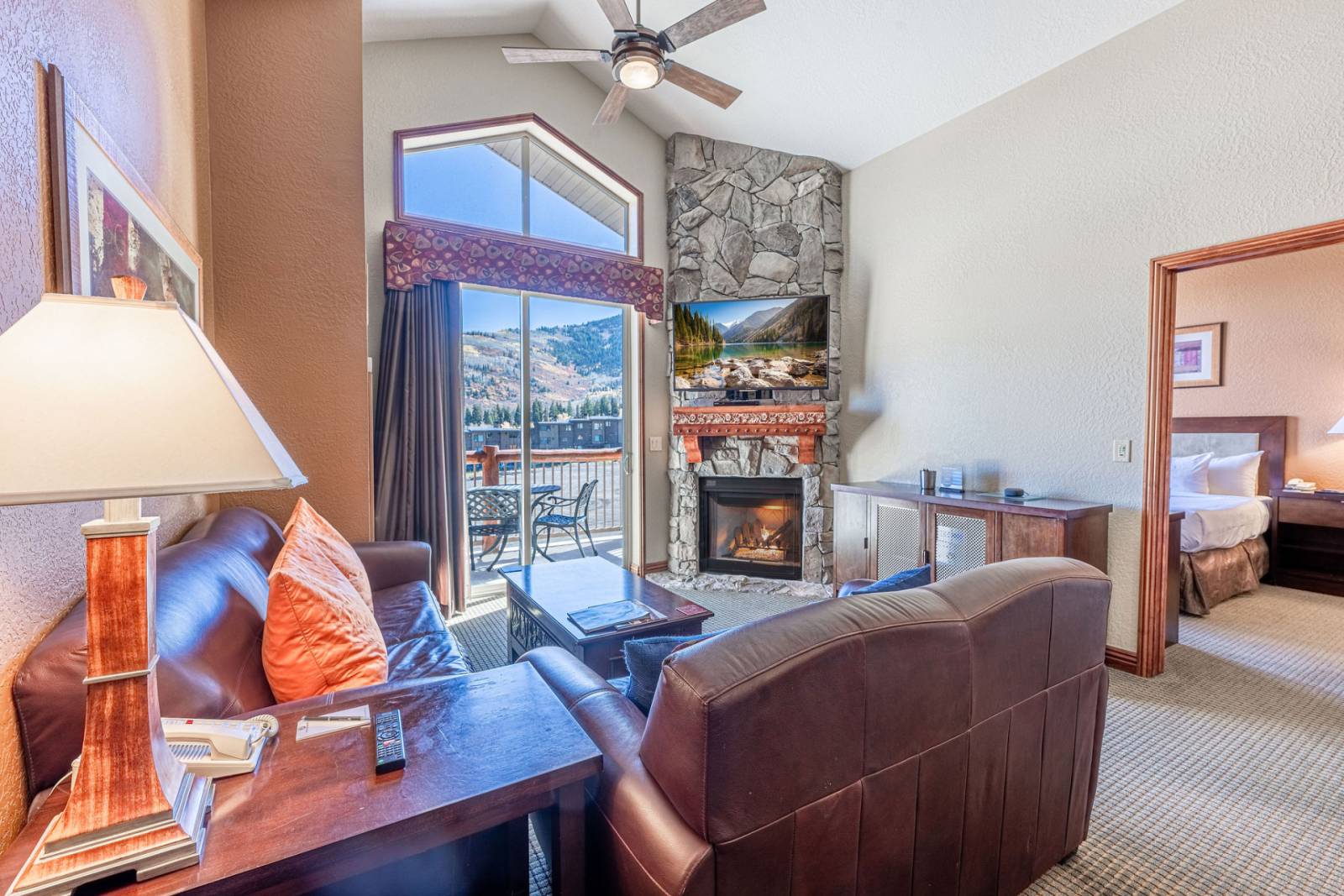 The cozy living room features an HDTV above a breathtaking floor-to-ceiling rock gas fireplace. The switch-operated gas fireplace instantly creates a cozy atmosphere. Enjoy ample seating options, including a queen sofa sleeper and a love seat.