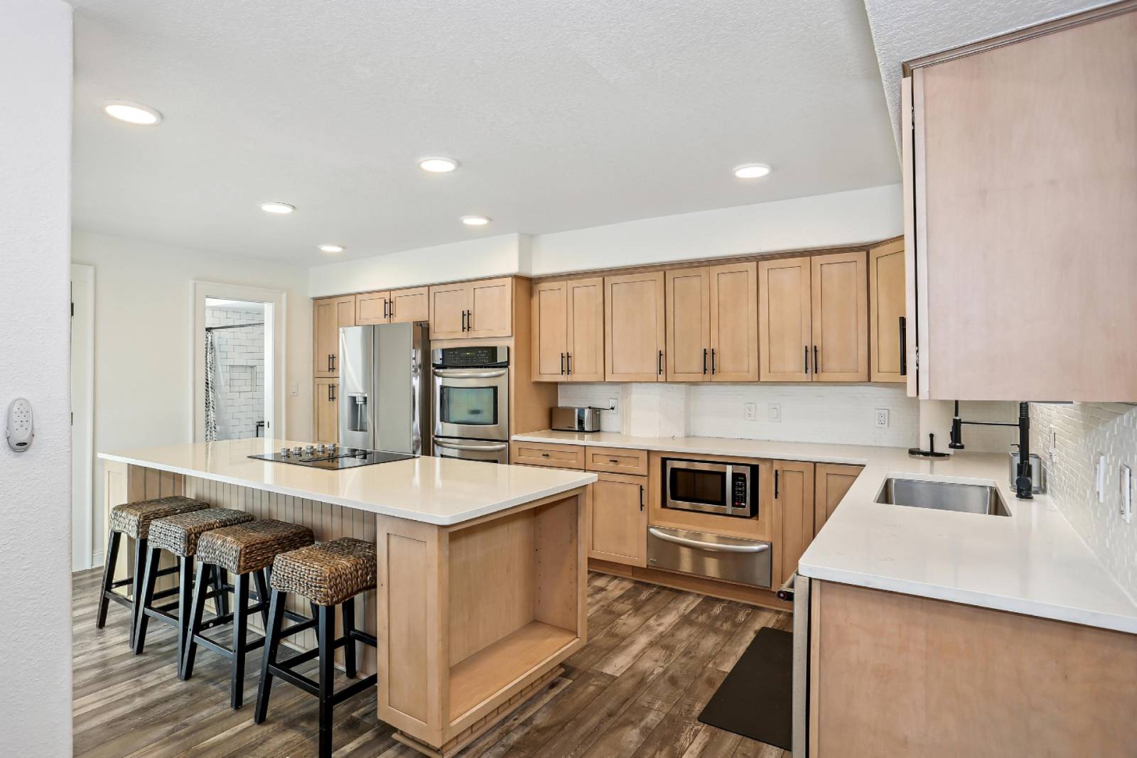 Inside, unwind in the spacious open-concept living area, complete with a large smart TV for movie nights. The gourmet kitchen is a true highlight, featuring quartz countertops, a tiled backsplash, an oversized island with seating, and stainless-steel appliances—perfect for preparing family meals or beach snacks.