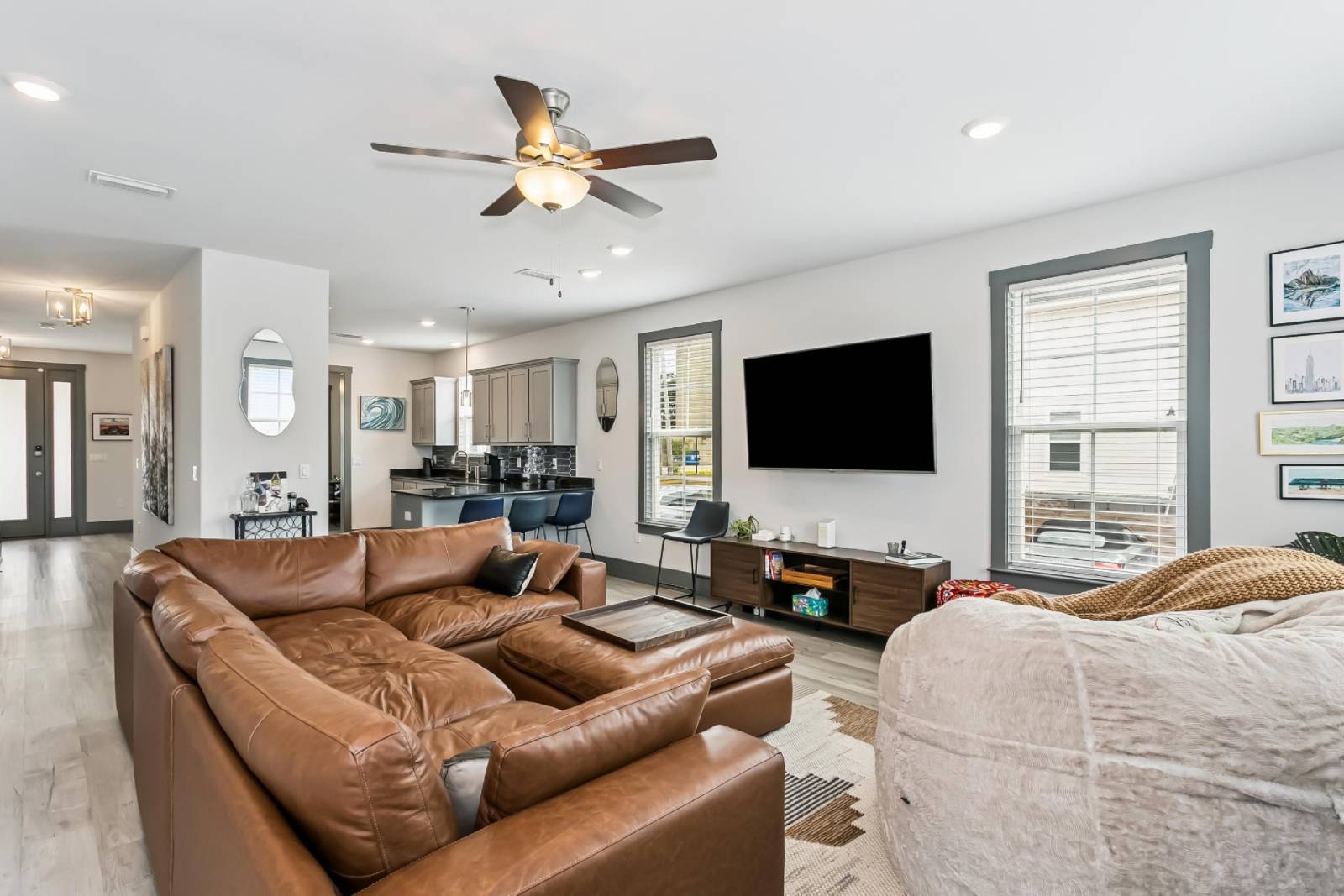 Thoughtfully curated with high-end finishes and modern design, the home offers a seamless blend of comfort and style. The fully equipped chef’s kitchen features stainless steel appliances, granite countertops, and a sleek tile backsplash, with bar seating for three that opens into a spacious, inviting living area. Relax on the oversized leather sectional or unwind in the cozy oversized bean bag—perfect after a day exploring downtown.