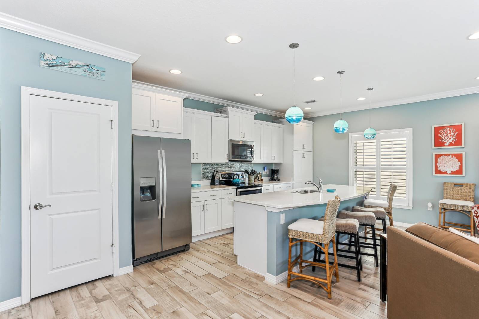 When you enter the villa, you will be on the main living level. This level includes a guest bedroom with queen bed, full bath, & an open concept living area comfortably furnished with a sectional sofa, chairs, dining table, & a breakfast bar with stools. The living room has a large smart TV, & the modern kitchen has stainless steel appliances along with all the necessary cookware & utensils to prepare delicious meals.