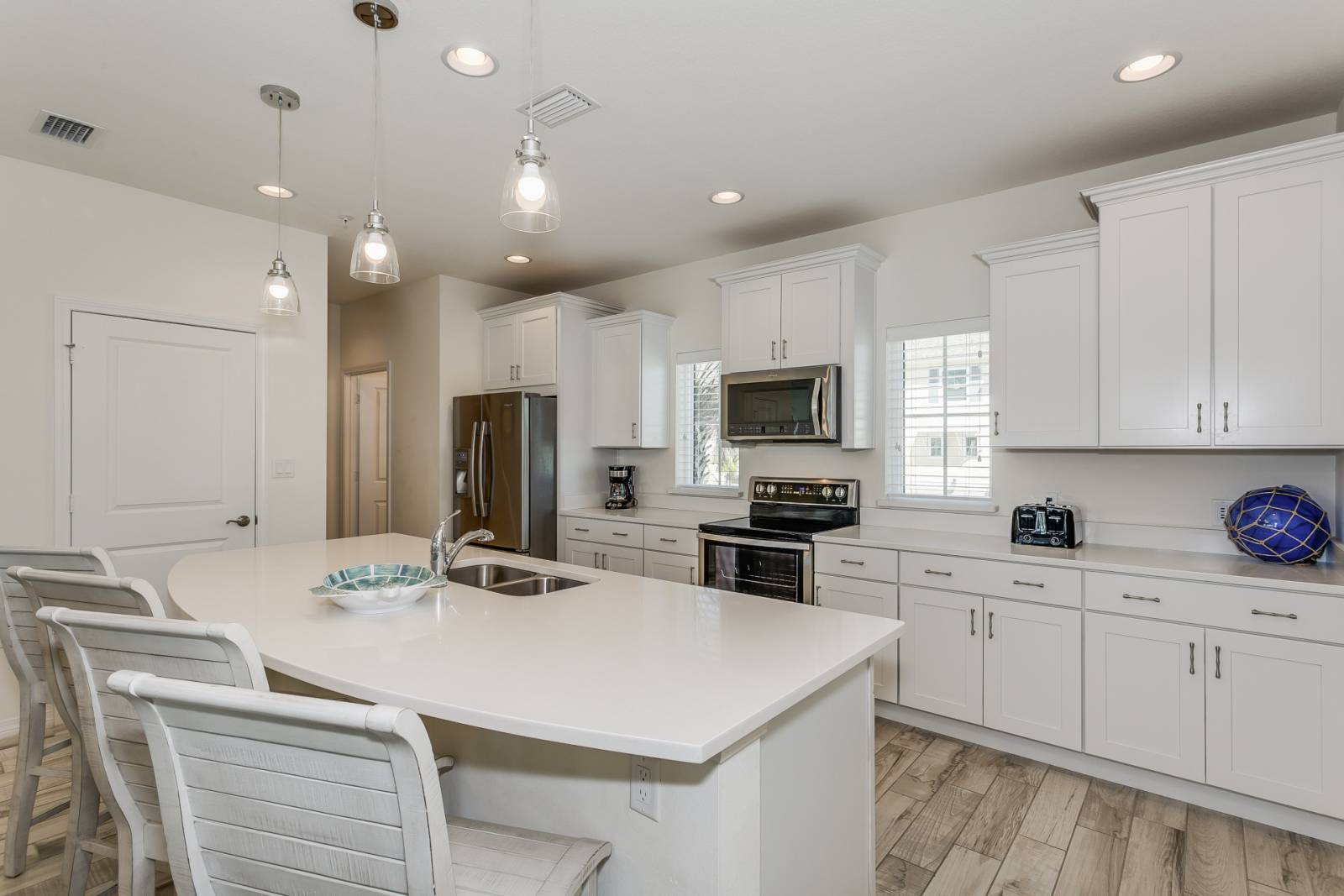 When you enter the townhome on the ground floor you will go up a flight of stairs to the open concept living area which is comfortably furnished with a sectional sofa with a full size sofa sleeper. There is also a wide chair twin sleeper, dining table, & a breakfast bar with stools. The modern kitchen has stainless steel appliances & all the necessary cookware & utensils to prepare a gourmet meal! The main floor also has a powder room for your convenience.