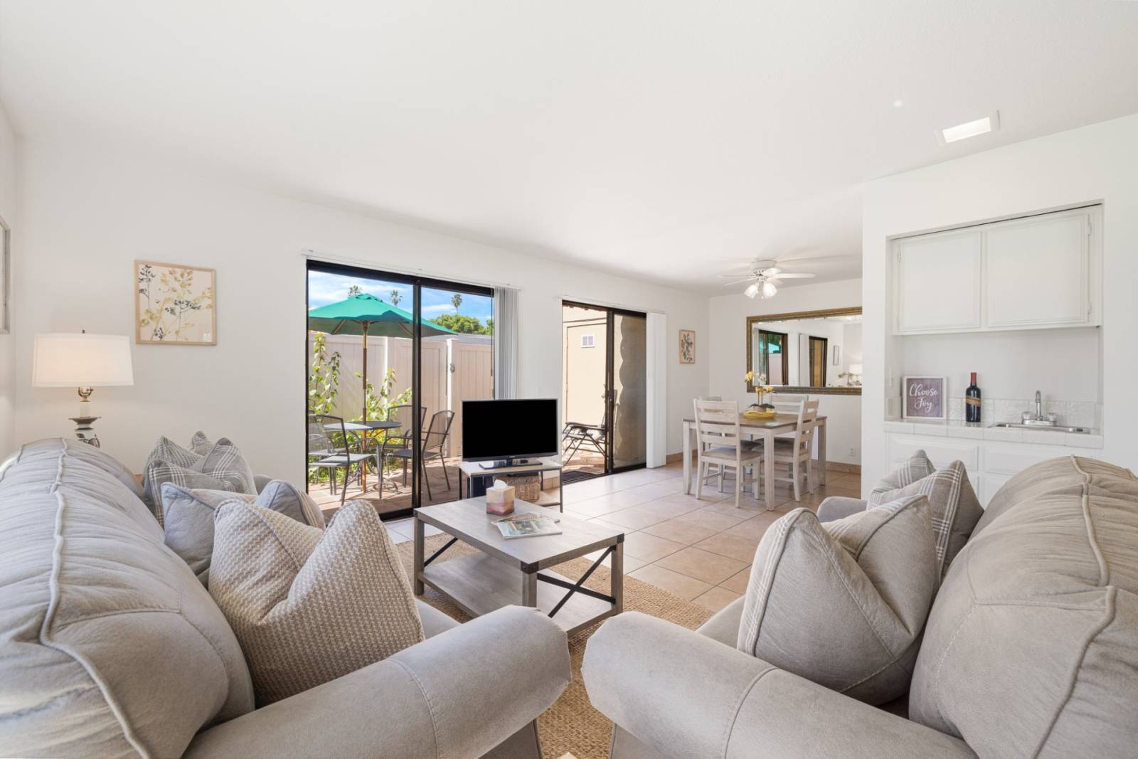 The bright condo features new furnishings designed for comfort, entertaining, and relaxation! The living room includes a large sofa and ample sunlight. The dining area and living room are connected, making it perfect for family or friend gatherings. Access the private patio to dine al fresco or catch some sun on the chaise lounges. The dining table comfortably seats four. The kitchen boasts a breakfast bar and everything you need for meal prep. Next to the living room is the office, with a work desk and a sofa for afternoon naps or overnight guests. A full-size washer and dryer are available for guest use. One covered parking space is assigned to the unit. Additional parking is available for guest use.