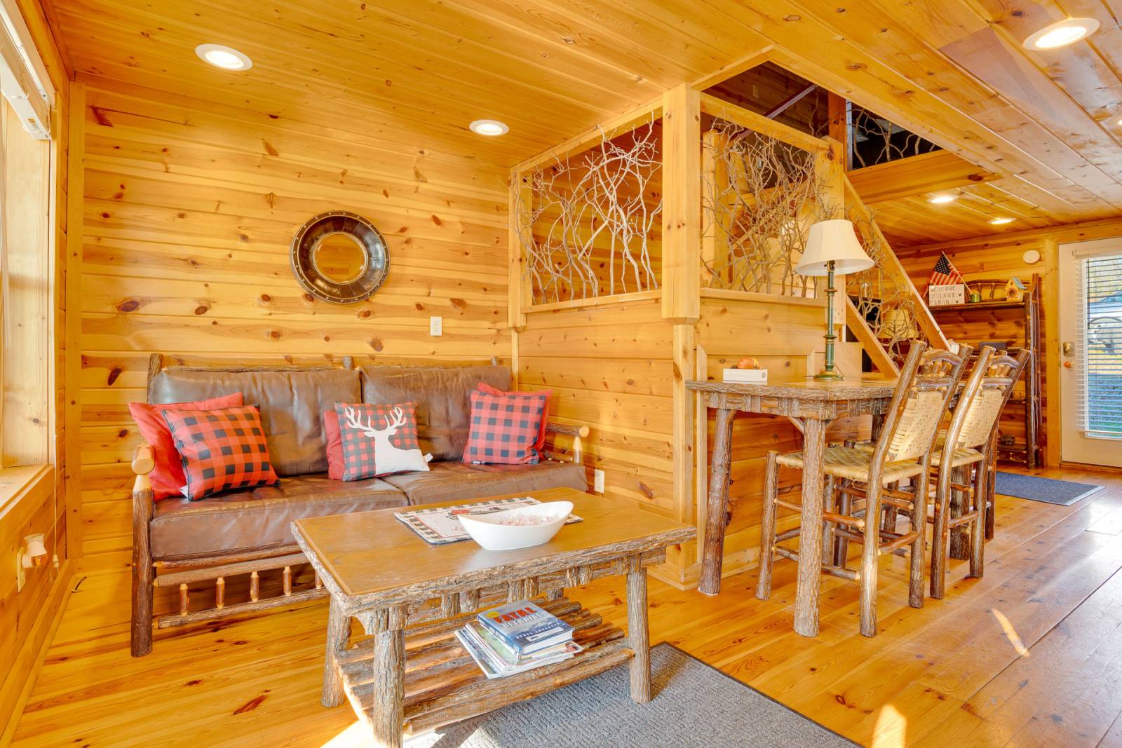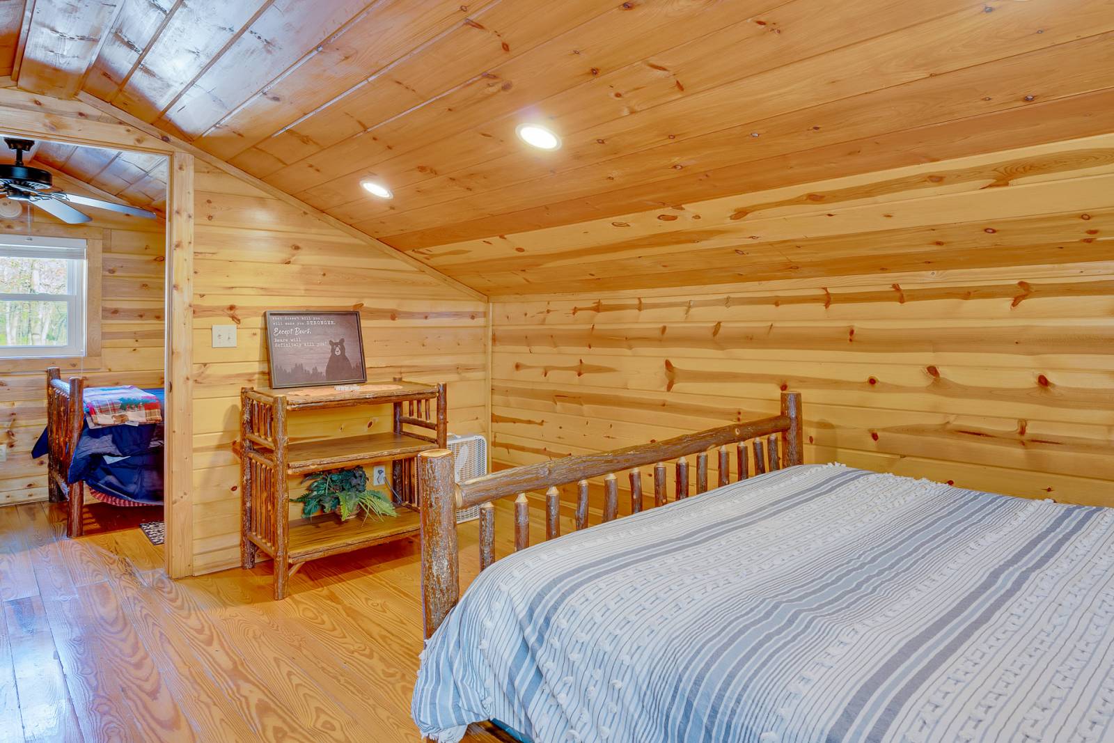 The cozy, 800 sq ft, two level cabin has just what you need for a romantic getaway or a trip away with the kids. The cabin sleeps up to 4 people with room for one additional on the living room couch. On the main level, there is a stocked kitchen, comfy couch and living space, bar stool seating, TV with Dish Satellite and a full bathroom with a shower. At the top of the hickory lined stairs, you will find a loft with 2 twin beds and a private bedroom with a full bed. Steps away from the cabin and deck, you will find a large fire pit area to enjoy the lake and mountain views.