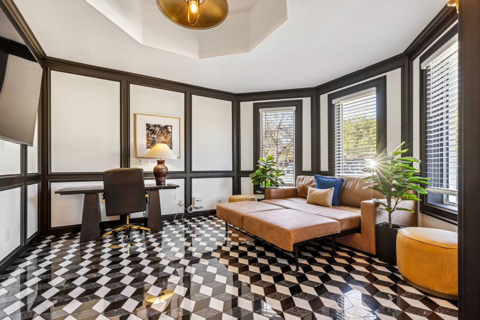 Step into a stunning dining space featuring bold patterned flooring, warm wood furnishings, an impressive gold chandelier, and abundant natural light. It’s the perfect setting for family dinners, celebrations, or a quiet morning coffee.