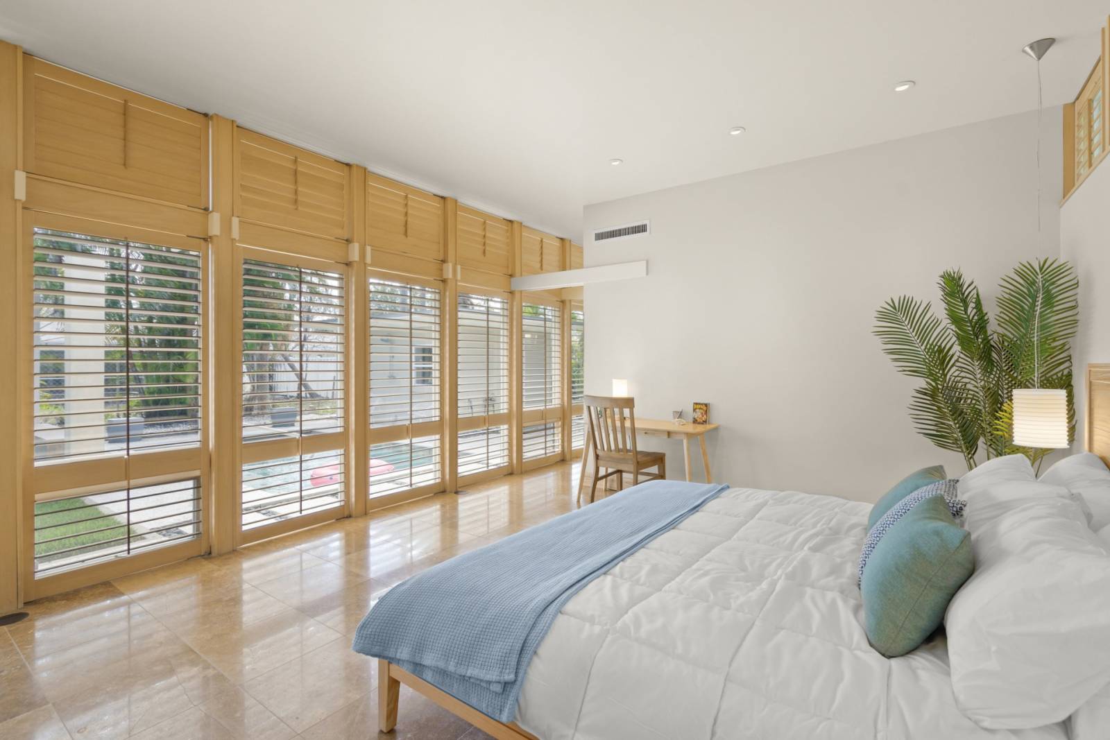 - Master bedroom: king bed, glass doors with backyard views, ensuite bathroom, work desk