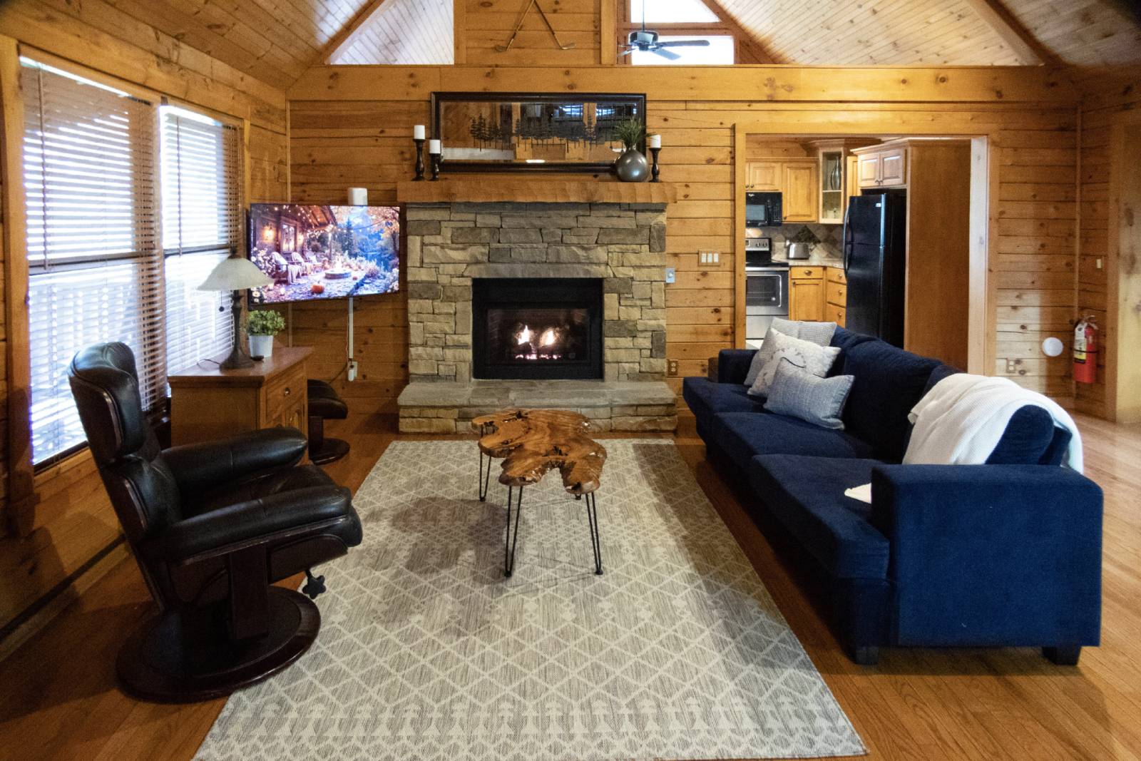 Step inside and you’re greeted by warm wood tones, vaulted ceilings, and a welcoming open floor plan that feels both spacious and intimate. Large windows fill the space with natural light during the day, offering peaceful views of the surrounding forest while creating a seamless connection between indoors and out. A comfortable sofa and chairs invite conversation, relaxation, or an afternoon nap after a day of exploring nearby trails or simply soaking in the stillness.