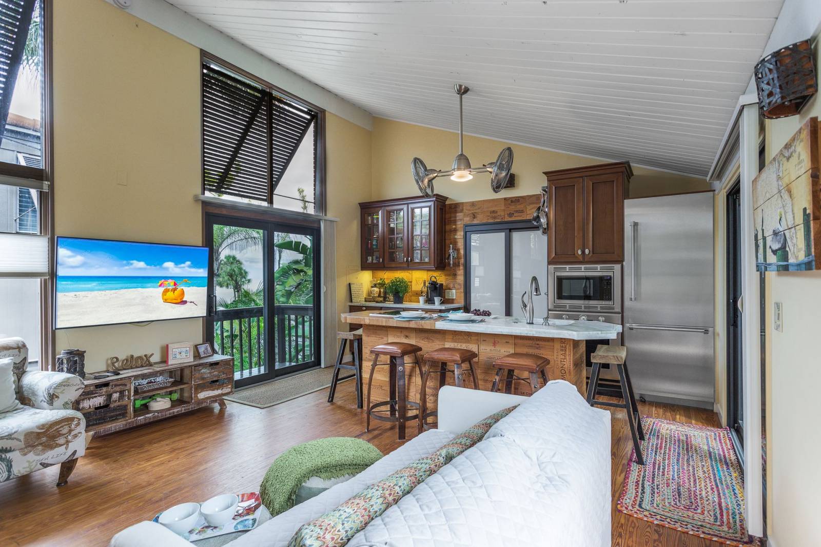 - Living Room: Relax on the sofa sleeper with a new coffee table, vaulted ceilings, and a Samsung Smart TV with WiFi and cable.