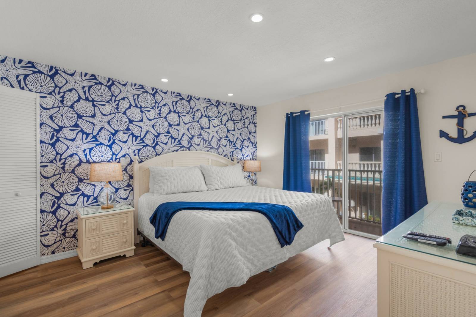 - Master bedroom: king bed, smart TV with DirecTV streaming, walk-in closet, ensuite bathroom with tub/shower combo, slider to the balcony