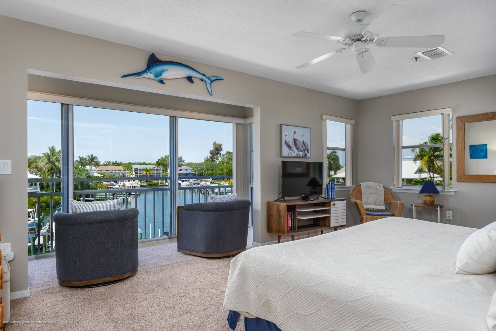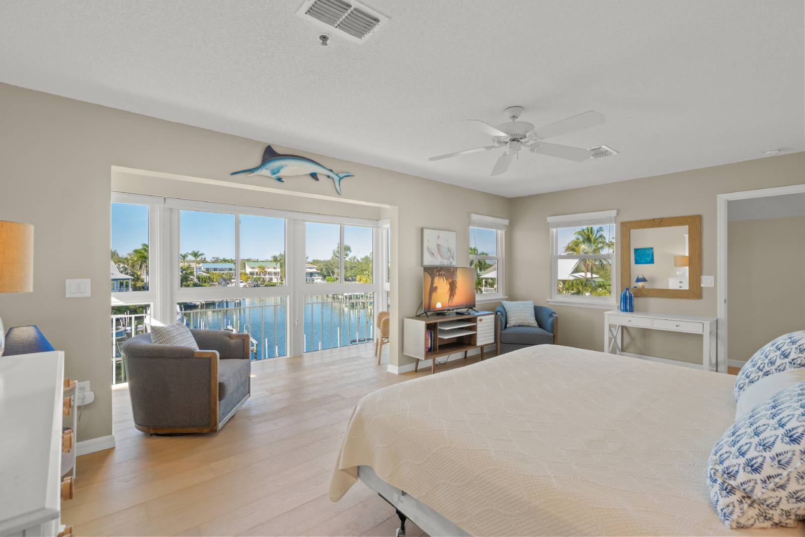 - Master Bedroom (upstairs): King bed, Smart TV, walk-in closet, ensuite bathrooms, access to enclosed balcony, view of the water