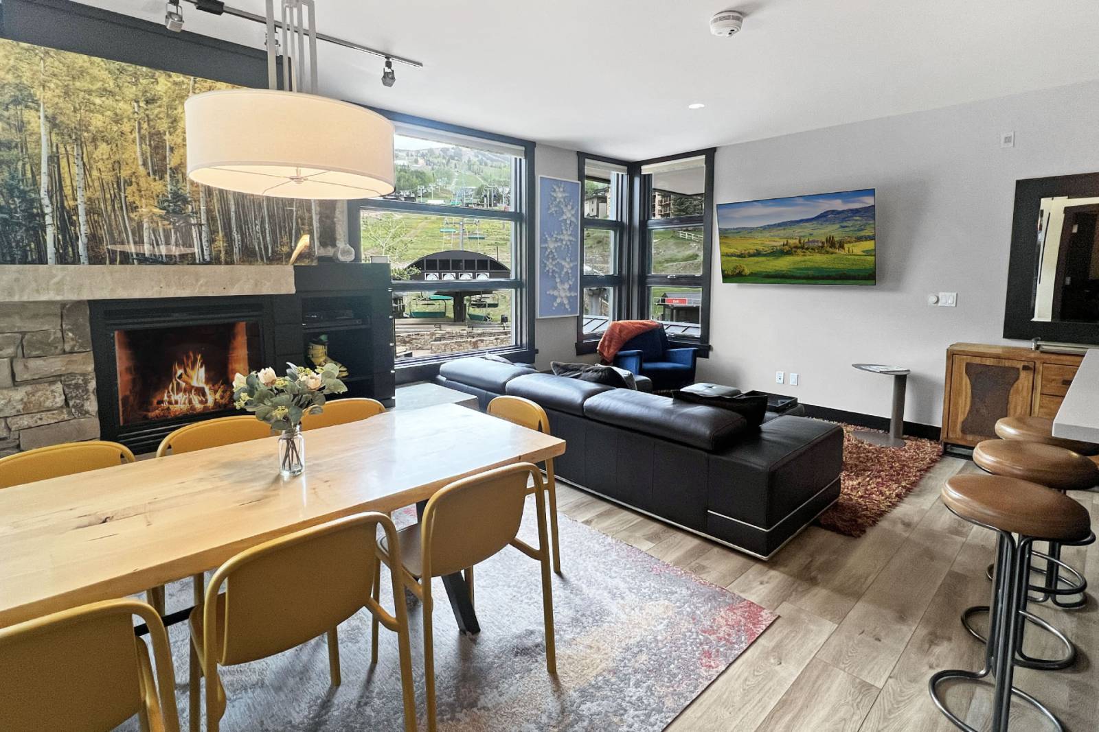 *Open-concept living area with gas fireplace, sectional sofa, and wall-to-wall windows showcasing mountain and plaza views
