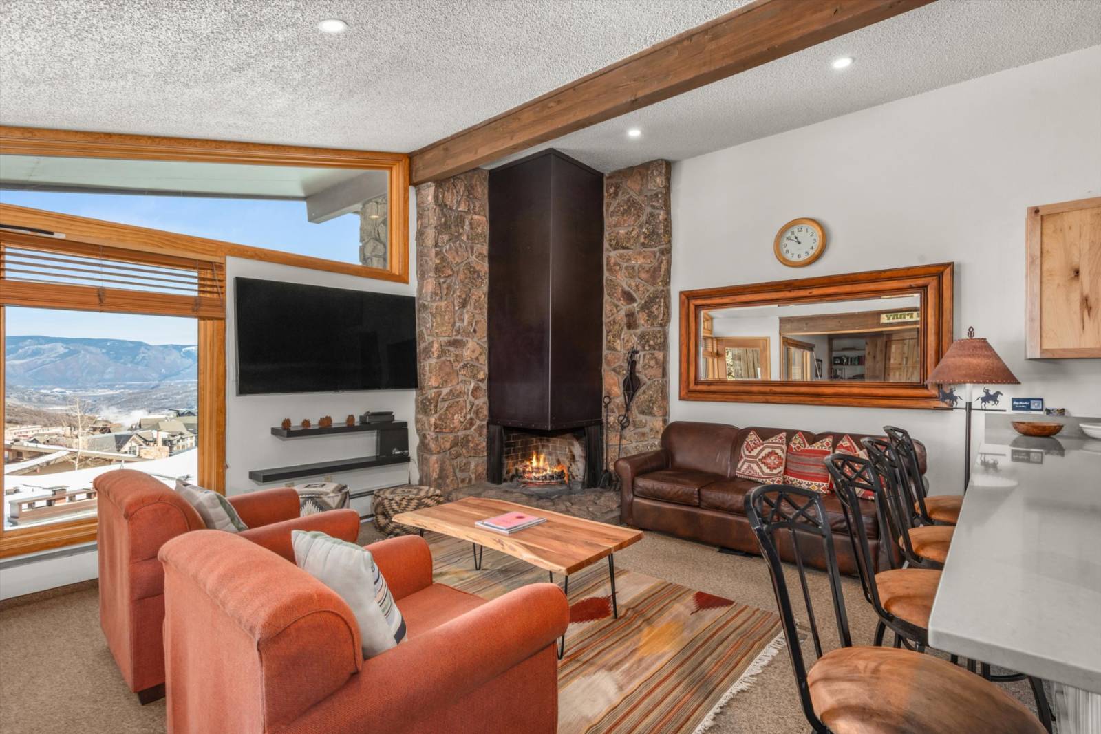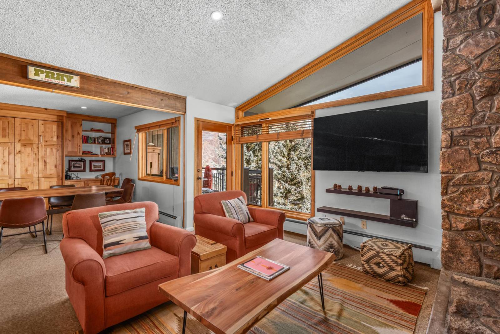 Tucked right up on Snowmass Mountain, the Shadowbrook condos have an amazing location offering Snowmass adventures such as hiking and biking right out the door. Unit 303 offers incredible views and lots of natural light from the floor to ceiling windows. The remodeled kitchen area was finished with warm wood cabinets contrasted with the ivory countertops and inviting bar stools for a cozy feel. Adding to the cozy feel are the wood burning fireplace and comfortable living room furniture. Enjoy a nice relaxing apres adventure on the balcony while taking in the view or end the day by relaxing in front of the fireplace or sharing delicious dinners together at the dining table while discussing the next days adventures in Snowmass.