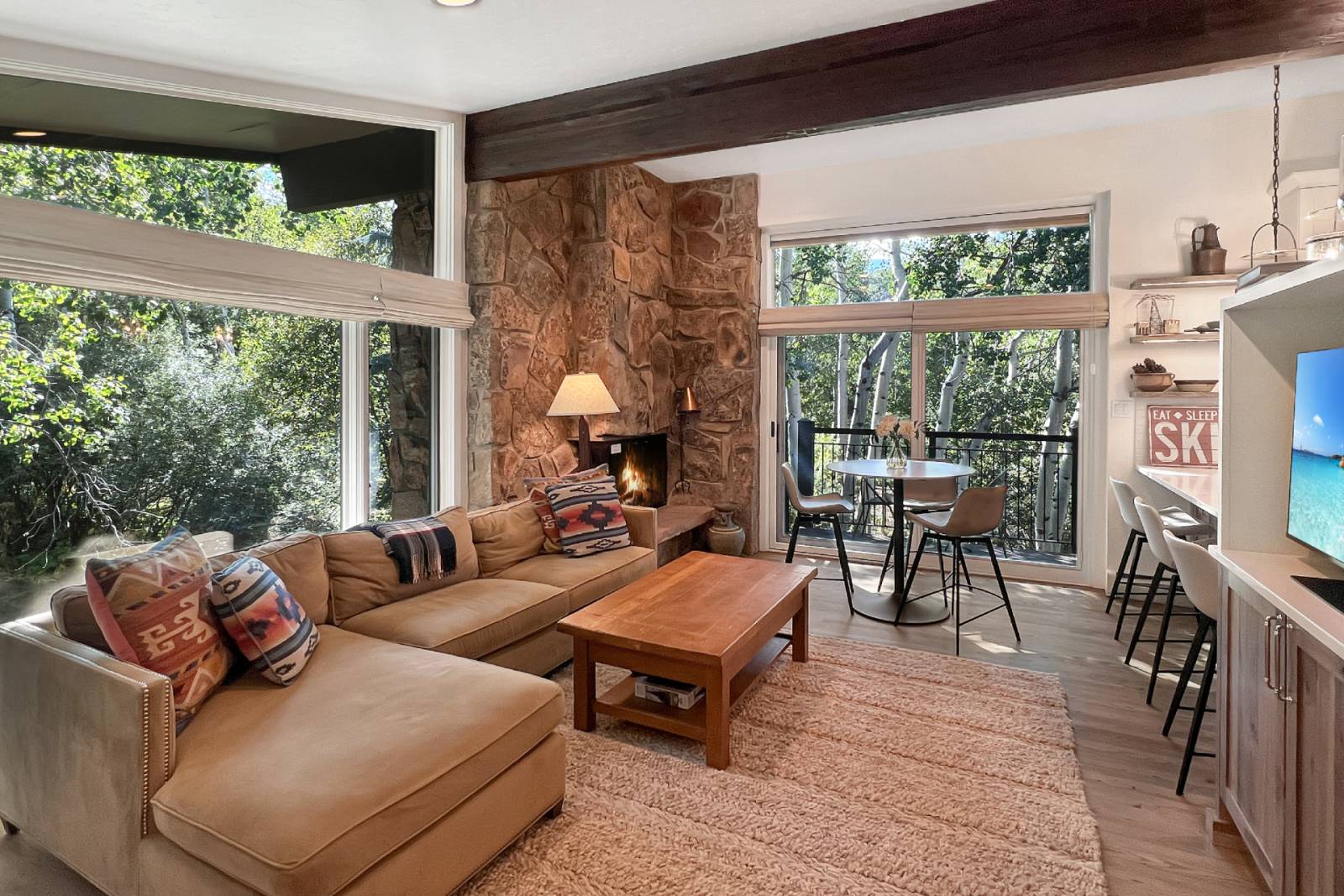 The open and bright living area has a beautifully remodeled kitchen with 4 breakfast bar stools. Enjoy a morning coffee here while pouring over the trail maps and planning the day ahead. The dining table, in front of the wood fireplace beckons you to sit and enjoy a meal with your travel companions or a board game to pass a cozy evening together.