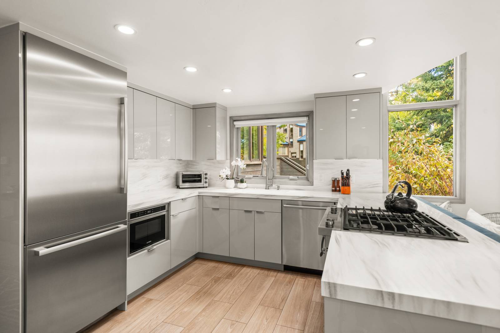 *Comfortable & Stylish Living – Vaulted ceilings, large windows, gas fireplace, and a fully equipped kitchen with dining for eight create an inviting open-concept space ideal for relaxing after a day on the slopes.