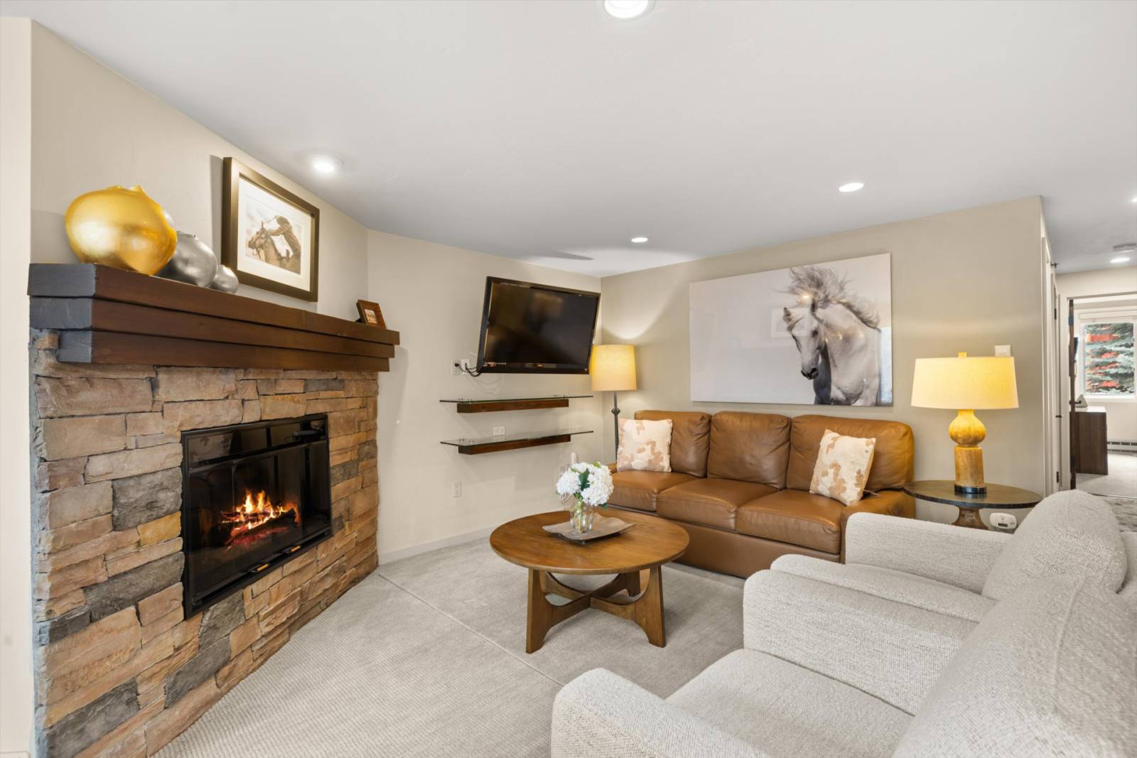 *Comfort and updated finishes – Fully equipped, modern kitchen, in-unit washer/dryer, dining for six, cozy gas fireplace, and a 42″ flat-screen TV.