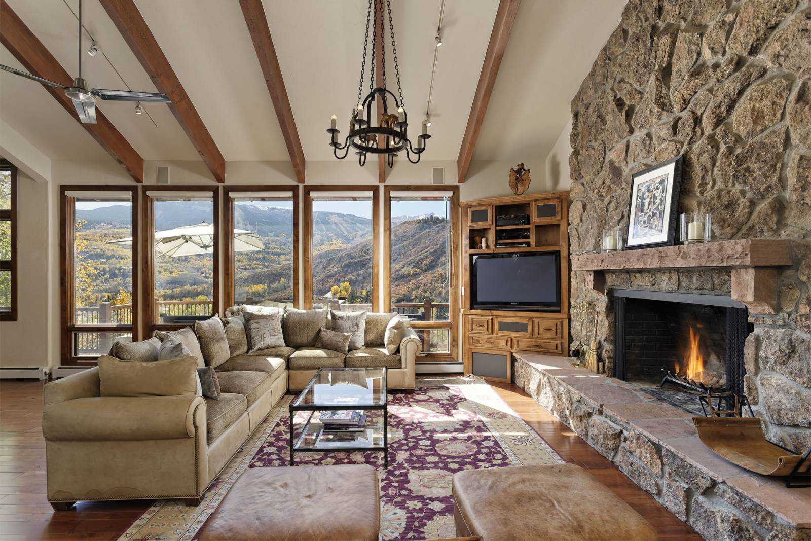 Living room with 55 inch flat screen TV, surround sound, vaulted ceilings, floor to ceiling windows with incredible views of the Snowmass ski area