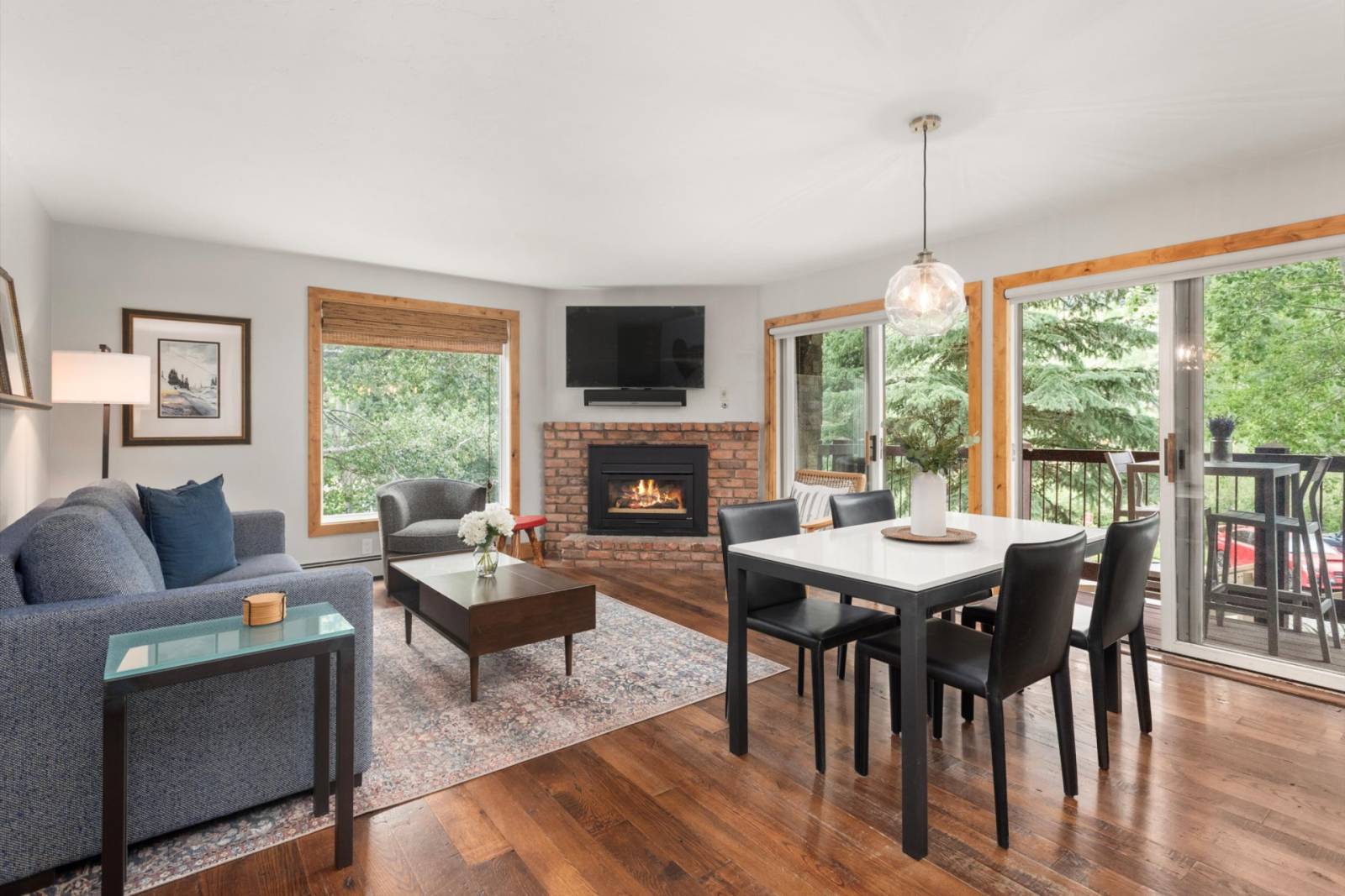 Unit 4AB is a ground-level, end-unit condo in Woodbridge that’s just one flight up from parking. Hardwood floors, an updated kitchen, and floor-to-ceiling windows make it bright and inviting. The open living area is perfect for gathering, and the private deck is ideal for grilling and enjoying the fresh mountain air.