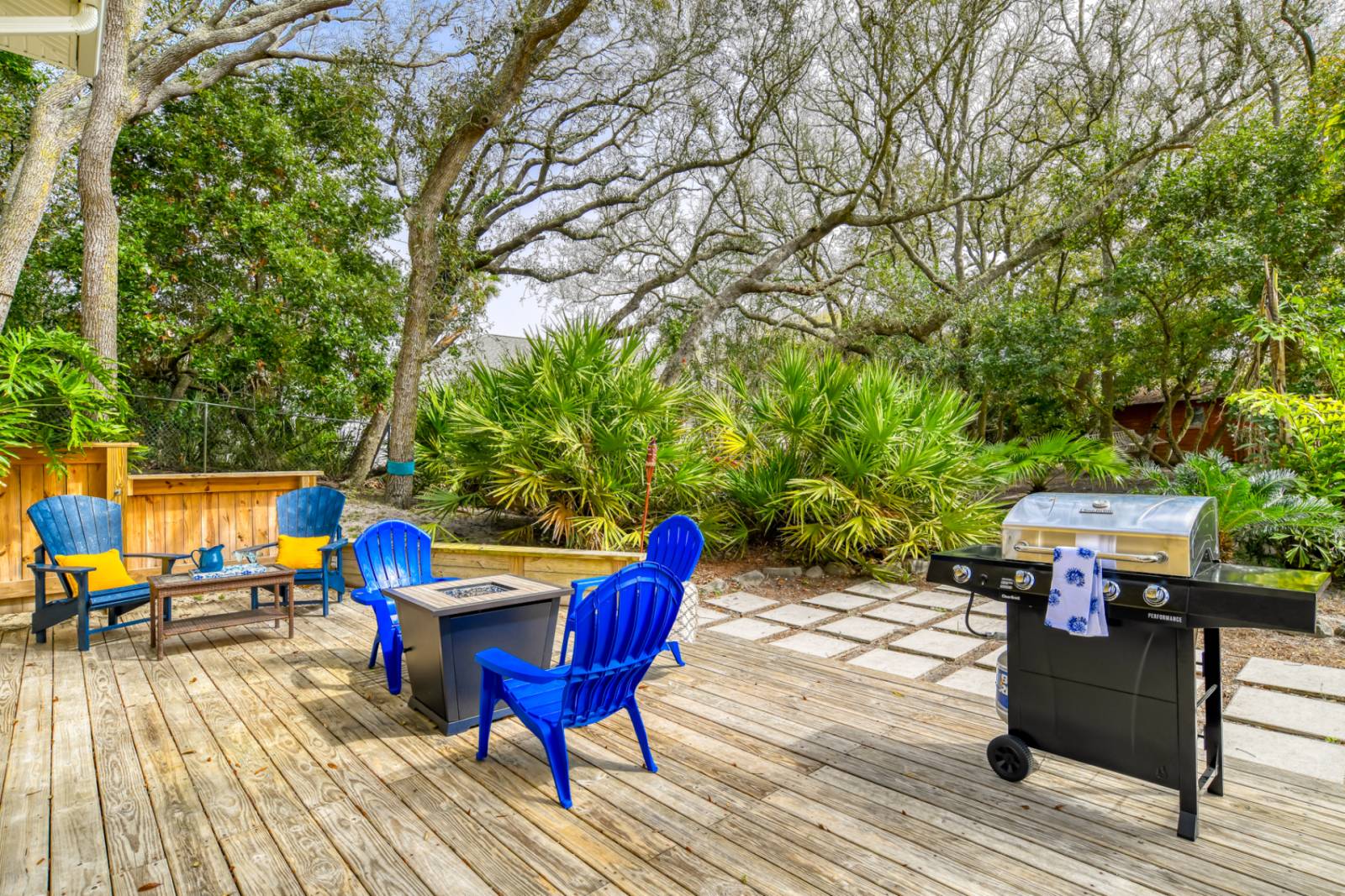 Inside, four large bedrooms provide plenty of sleeping space, including two master suites, each equipped with a comfortable king sized bed, one upstairs and one downstairs. In addition to the master bedrooms, there is a downstairs bedroom with two full beds and a dedicated workspace, and an upstairs bedroom with two queen beds and plenty of storage for all of your items. The third full bathroom is located upstairs across from the queen bedroom. Roomy living space is strategically located on the second floor to allow you to enjoy ocean breezes. Step outside to breathe in the salty air and enjoy a cup of coffee or a glass of wine on the balcony, which is located just off the open dining and kitchen space which is recently updated and fully equipped with everything you will need to make your favorite meals! There is a drip coffee maker, a Keurig, coffee bean grinder, and a soda stream all available for you to enjoy! Unwind on the large sectional in the living room while enjoying your favorite shows on the streaming TV. A large laundry room is located on the first floor, as well as access to the backyard oasis.