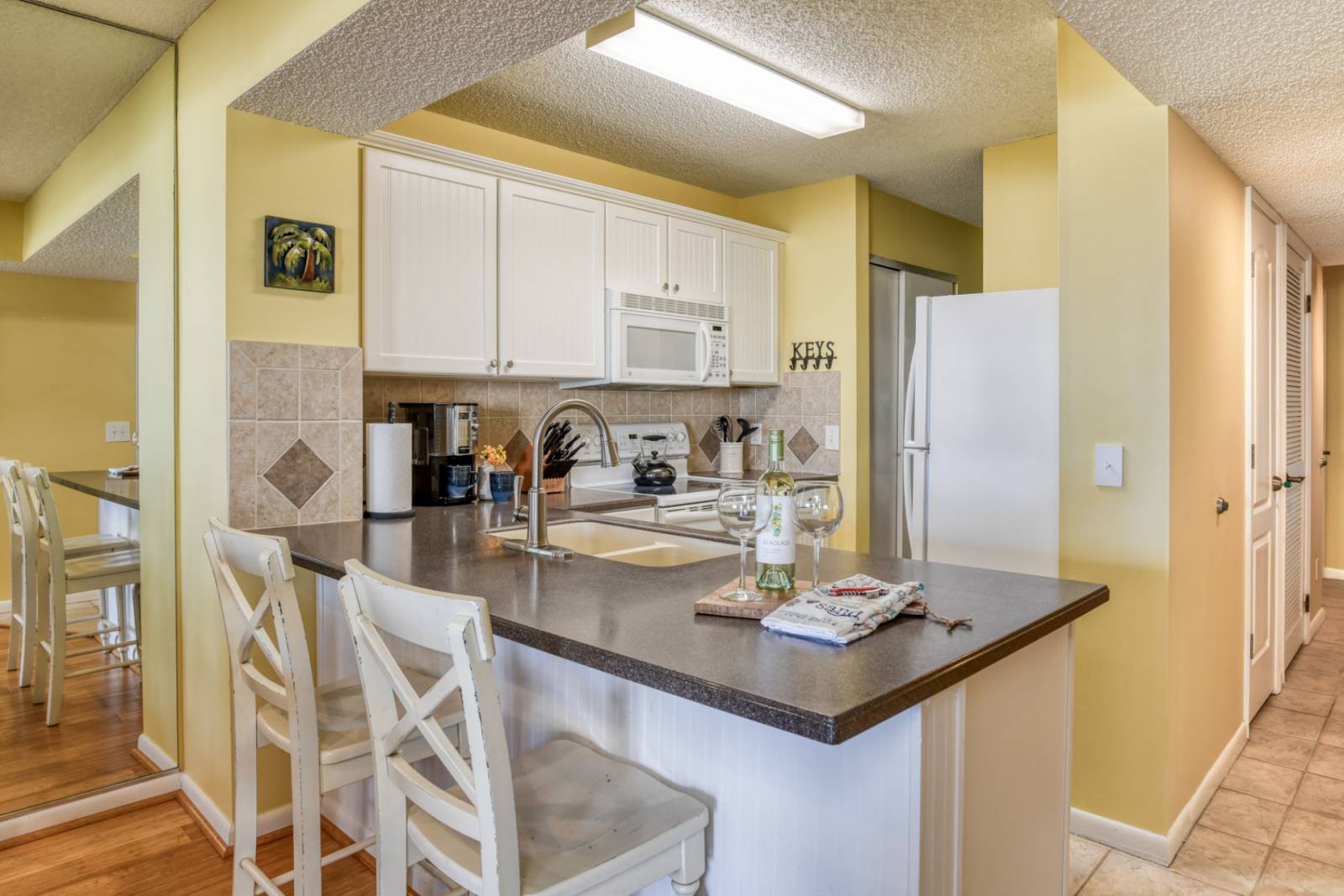 Ocean and historic St. Augustine themed artwork surrounds you in this second floor unit which is conveniently located right beside the elevator. Inside there is plenty of space to cook and enjoy meals and relax in the comfortable living space and large covered balcony while listening to the ocean waves. An ocean-view master, furnished with a king-sized bed, and a guest bedroom are both ensuite with walk-in showers. A small third bedroom provides extra sleeping space for the kids. Bedrooms are outfitted with crisp white linens and bathrooms are supplied with starter amenities and soft white towels.