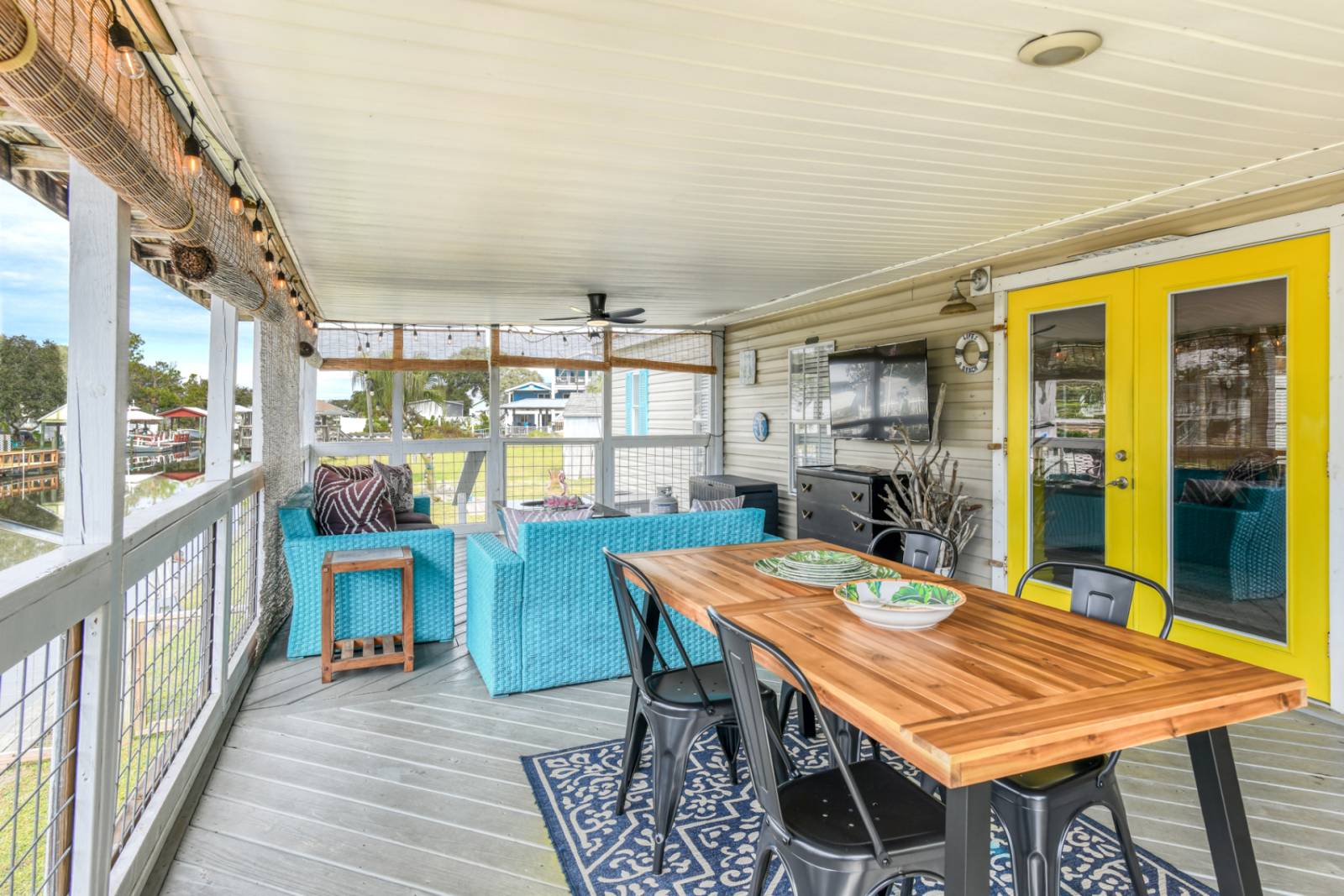 Welcome to Riverside Paradise, a beautifully updated riverfront home that is perfect for boating, fishing, kayaking, and wildlife viewing. You will love soaking in the sunsets from a comfortable seat on the screened patio. Fire up the grill and turn on the outdoor TV to enjoy your favorite shows as you gather to make lasting memories with family and friends. The private dock is ideal for fishing and launching kayaks, be on the lookout for a variety of birds, dolphins, and manatees! The extended dock, floating dock, and gangway are a dream come true for your waterfront getaway. Sip your morning coffee on the screened front porch and enjoy the serenity of the beautifully landscaped and fully fenced front yard. Step inside for even more fun and relaxation. The home has been recently renovated and features custom finishes throughout. You are sure to rest well in the three bedrooms, featuring soft linens and brand-new mattresses. Wash your cares away in the spa-like bathrooms, which are equipped with fresh white towels. The fully stocked kitchen has everything you need to prepare your favorite foods and drinks, and there is plenty of space to enjoy them at the counter and around the dining table.