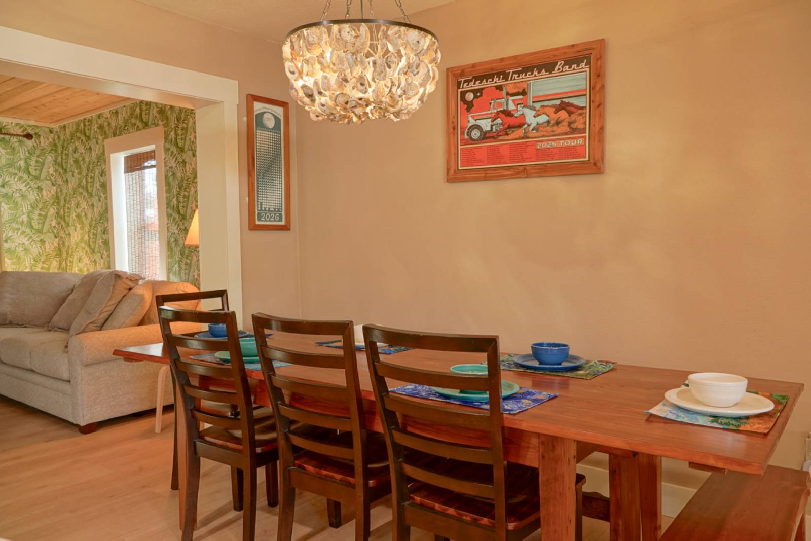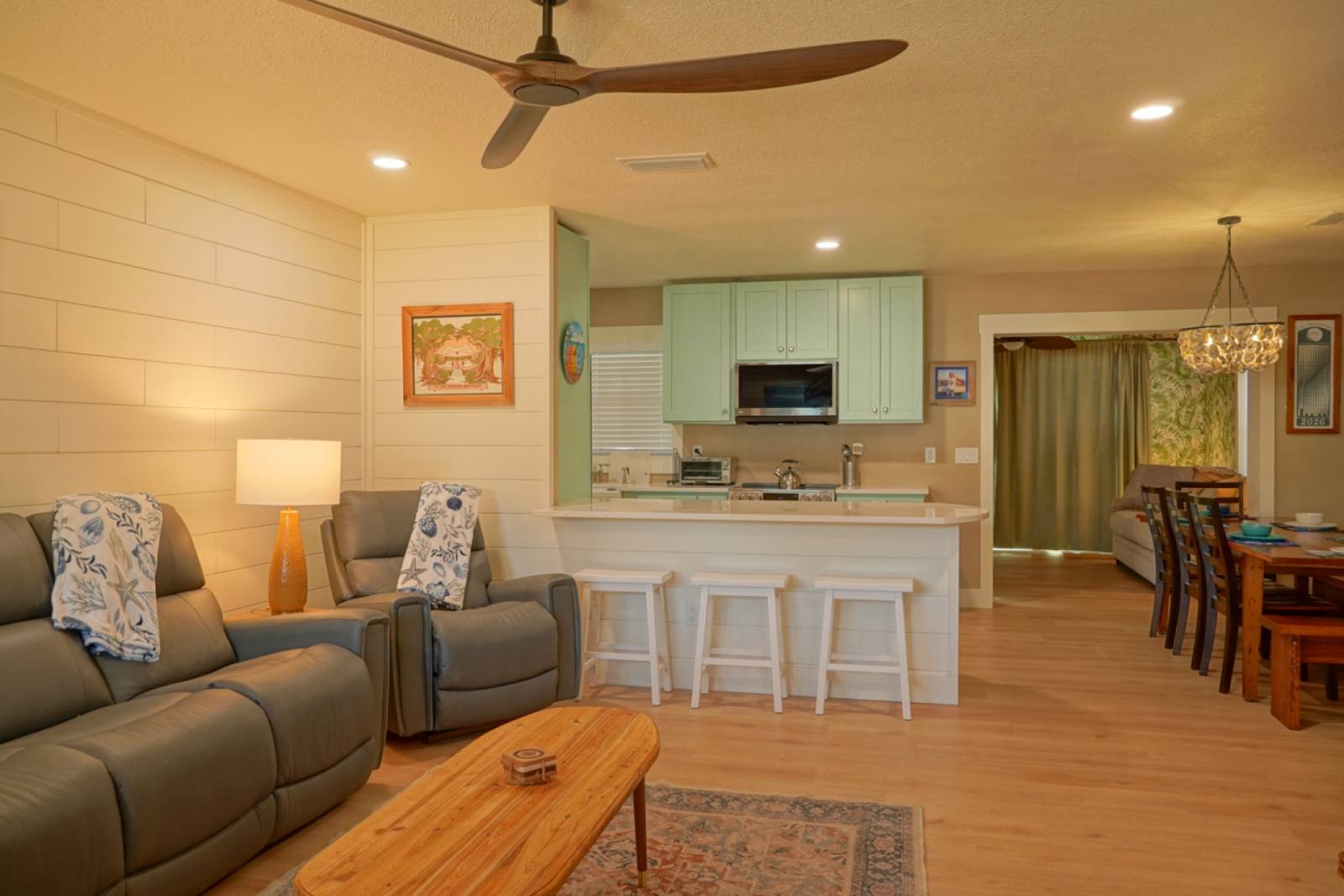 The open concept floor plan invites your group to gather for fun, relaxation, and memory making. The fully stocked gourmet kitchen has everything you need to prepare your favorite recipes. Grab a seat at the counter or enjoy meals around the dining table. Take in your favorite shows and movies on the large smart TV as you get cozy in one of the comfortable seats in the living room. The coastal vibes continue in the sun room, featuring a sofa, smart TV, and a desk. Rest well and recharge in the three spacious bedrooms, each is equipped with soft linens, all new furnishings, and beautiful decor. The master suite features a king bed, smart TV, and a full bathroom with a walk in shower. There are two additional bedrooms; the first features a queen bed, the second features a queen bed and a twin bunk bed. The spacious hallway full bathroom is equipped with plush linens, plenty of storage, and a tub shower combo.