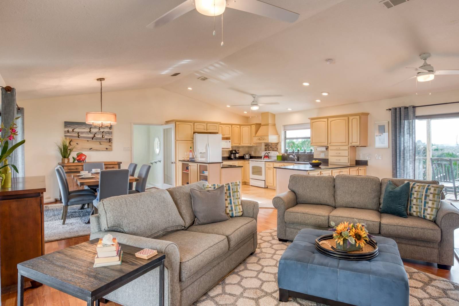 Sunshine Daydream sits just off the Matanzas Inlet, a beloved spot for fishing, paddle-boarding, and windsurfing. Multiple balconies allow you to make the most of the fresh outdoors, taking in ocean breezes, sunrises over the ocean and sunsets over the river while relaxing with family and friends. The split floor plan with three bedrooms, King and two Queen on the 2nd (main) floor, and Queen, Twin Bedroom, and Den Rec room on the lower floor make this house perfect for families or groups. The upstairs space also includes the main living area, gourmet kitchen, and dining, a large deck running the full length of the front of house that looks out over the water, and a rear deck with rockers looking out over the gorgeous trees in the backyard with a peak of the river. The lower level has a Queen bedroom w/rear deck seating area, Twin bunk bedroom, and Den/Gameroom featuring a sofa pullout, large screen tv, game table, Kitchenette, foosball and board games. Wake up to sunrise everyday over the ocean with your cup of coffee enjoying the ocean breezes! The downstairs den is a perfect spot for the kids to hang out and watch a movie or play a game of foosball. The house comes fully stocked with kitchen supplies so that you can cook "at home," along with soft bath and beach towels, and crisp bed linens. Enjoy a number of fine restaurants, plenty of bars, and local attractions, parks, and the beach all within a few minutes' drive.