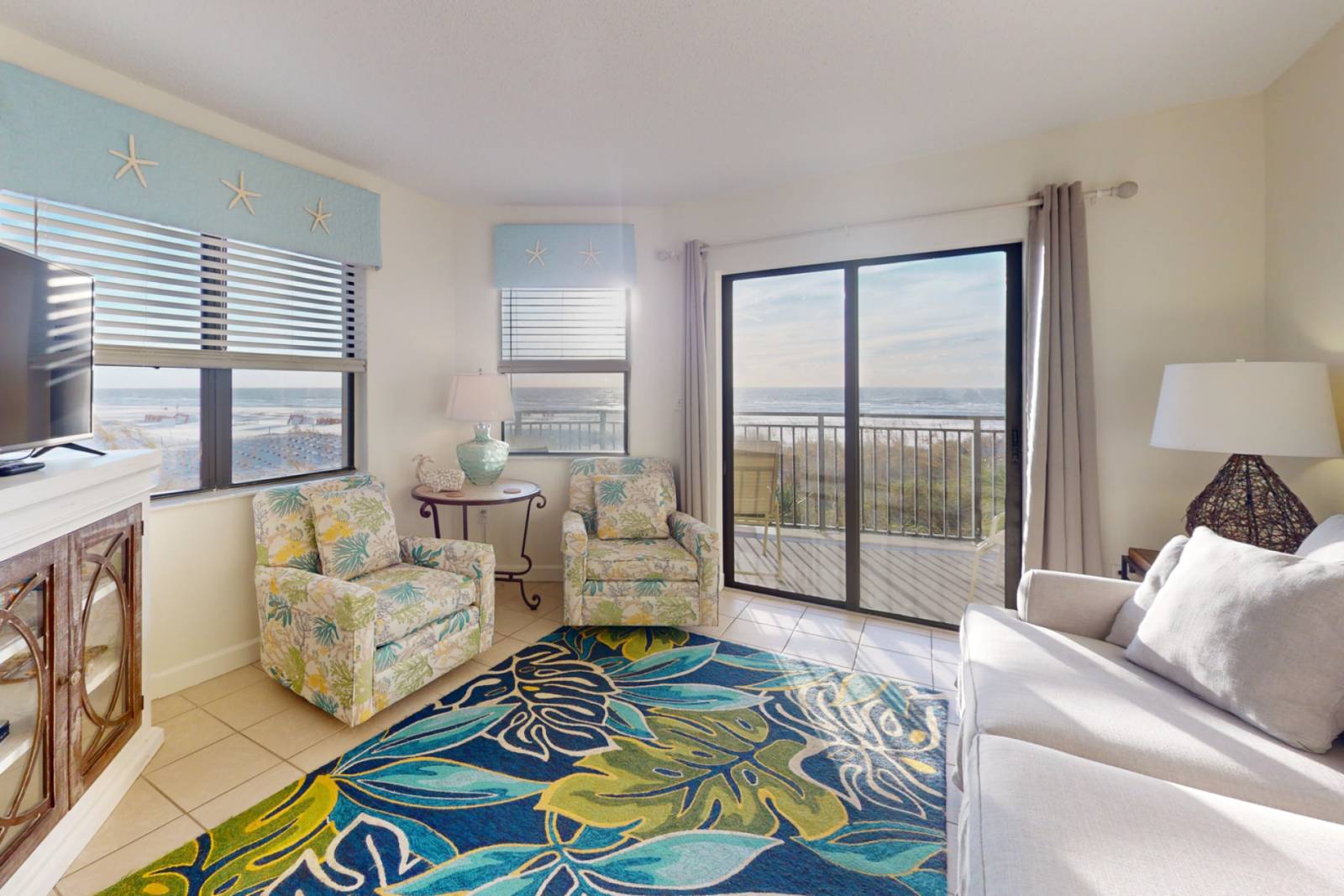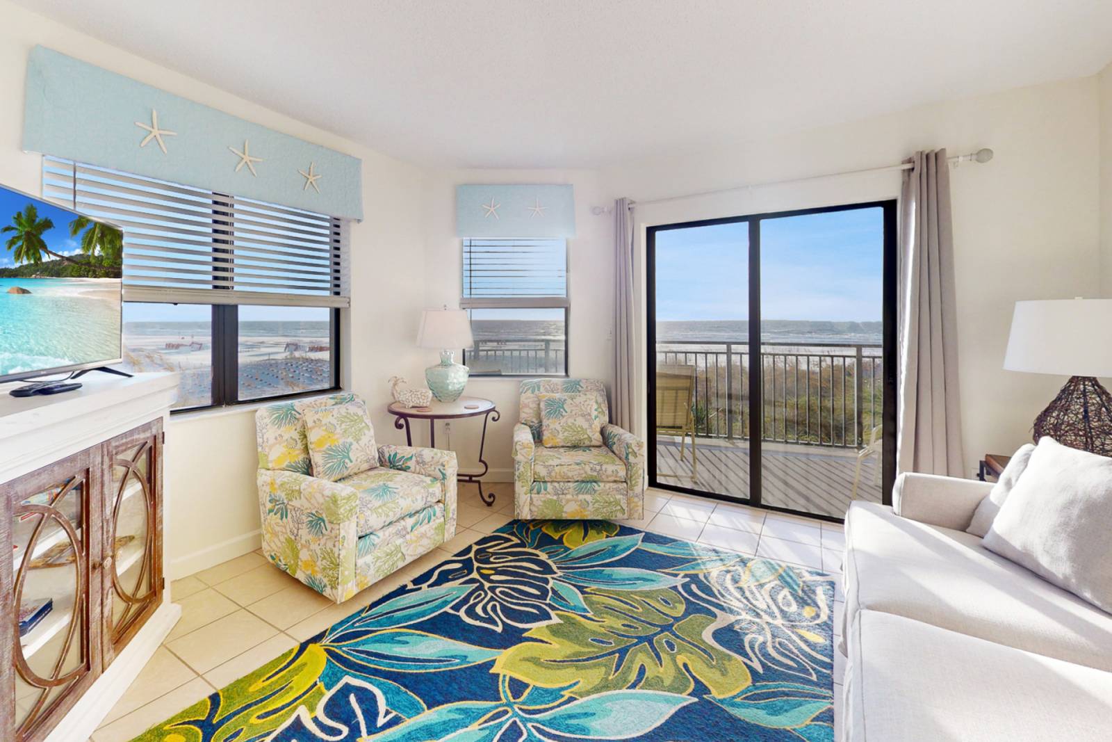 * Flat-screen TVs, cozy seating, and coastal décor