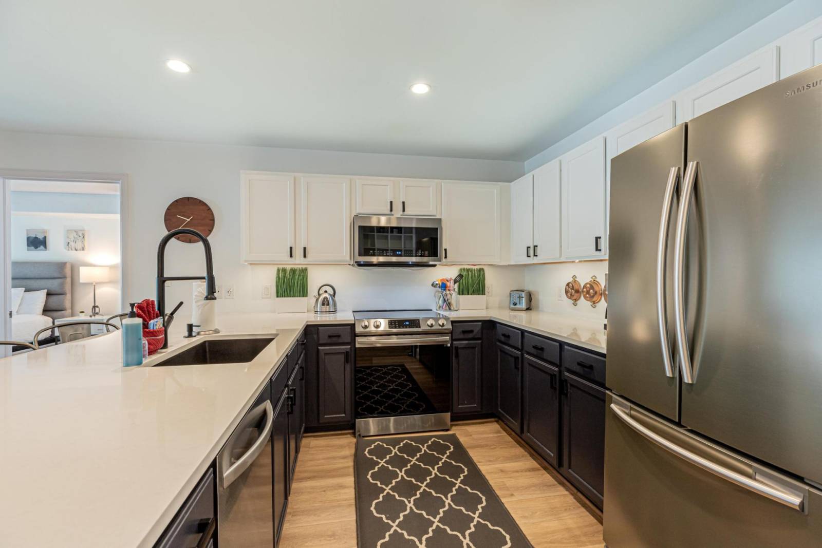 The open living area features a stunning modern kitchen with stainless steel appliances, gorgeous quartz countertops and everything you need and more, to stay in and make a meal. The bar stools at the kitchen counter make a great place to dine, have a beverage or keep the chef company.