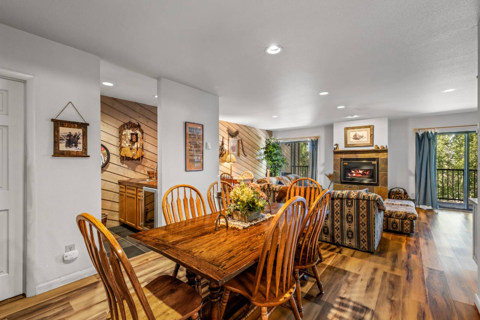 Enter the four level unit after a flight of 14 Stairs and find a sizable walk in entry closet with lots of storage (skis, boards, jackets, gear and more) as well as the full size washer and dryer. Level one also includes the fully stocked kitchen which has everything you will need to make a meal. It features stainless steel appliances and a large island with four bar stools, which is a great place to grab a bite or set up a lap top. Combined with high speed WiFi, this makes La Casa 12 a great remote working option.
