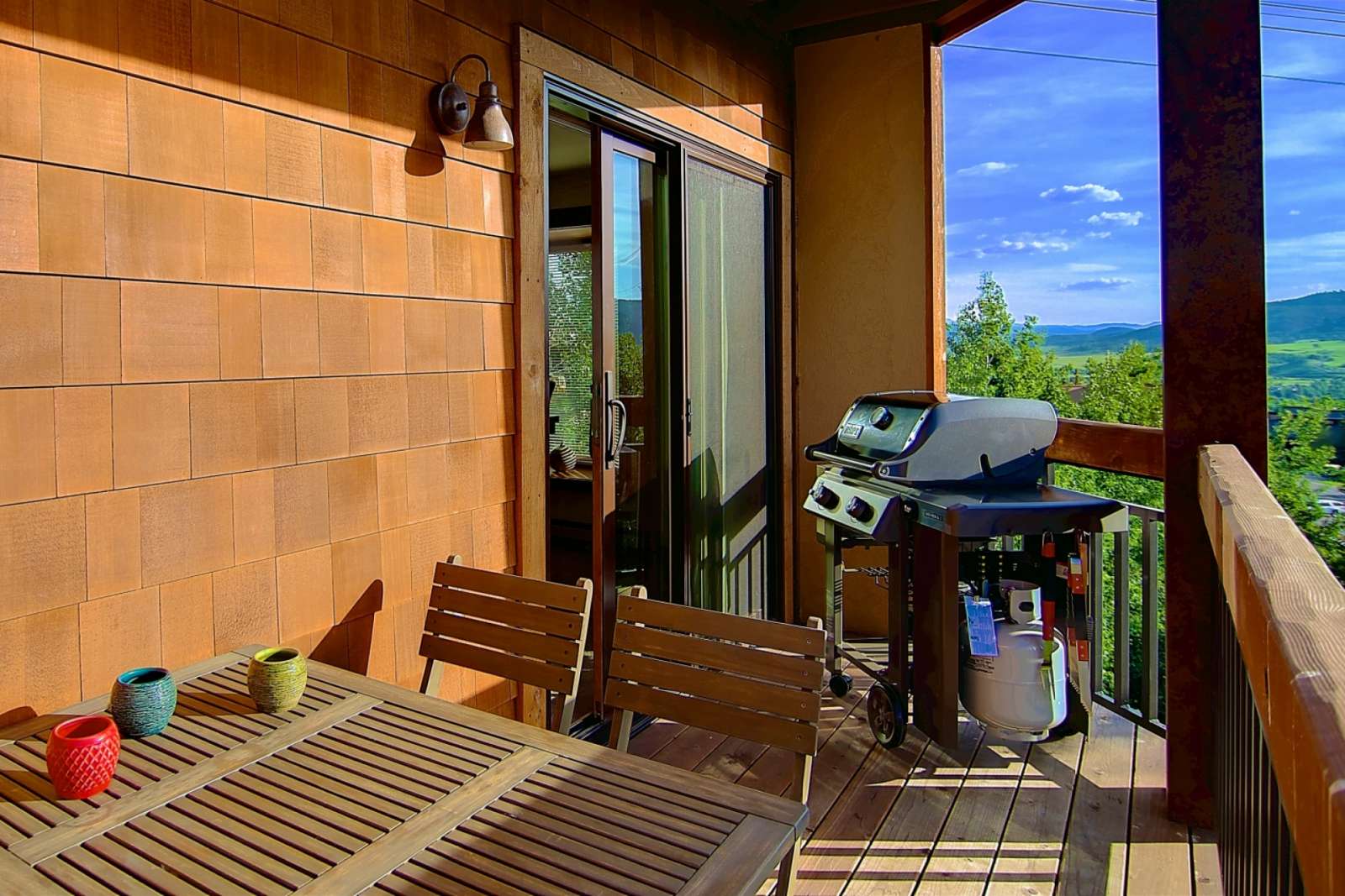 The open living area which features an updated kitchen with mountain-style wood cabinetry and granite counters. It is fully equipped with everything you would need for cooking a meal and there is a large, beautiful wood dining table off the kitchen, perfect for a family or group. Sit back and relax by the gas fireplace and take in the fantastic views. The living area has access to 2 decks with amazing views.