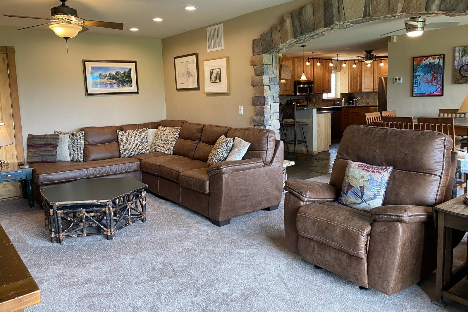 The dining and living areas are essentially one large living area and both feature incredible views, have their own balconies and provide ample seating with a large, hardwood dining table, 8 cushioned dining chairs, a comfy sectional, 2 soft leather chairs and an upholstered rocking chair. Eat, drink and enjoy the incredible views, what’s on the large flat screen tv or your game of choice. The entry, kitchen, dining and living areas are kept toasty by a gas fireplace.