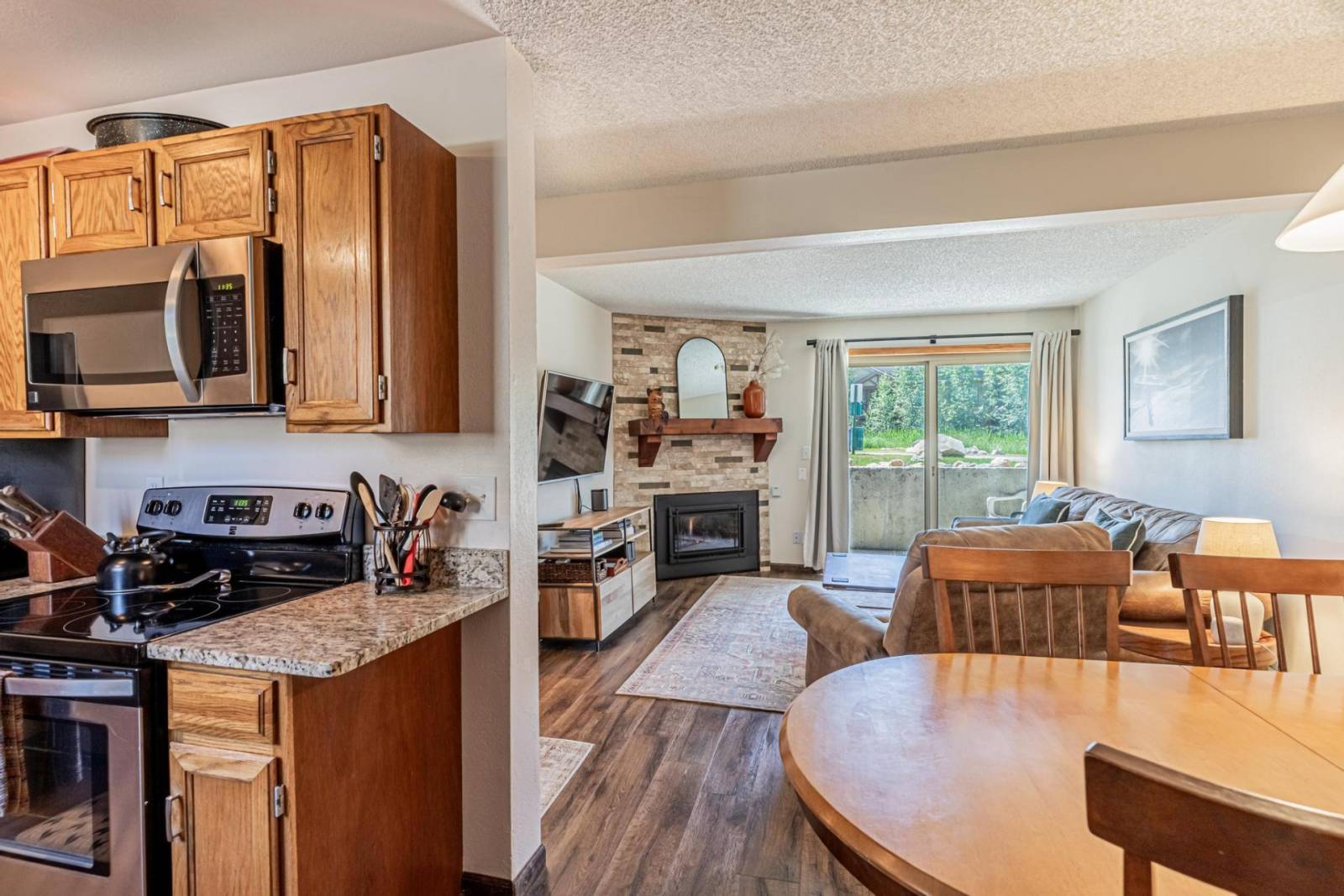 The full kitchen is off the living area and features gorgeous granite countertops and stainless steel appliances and has everything you will need to stay home and make a great meal.