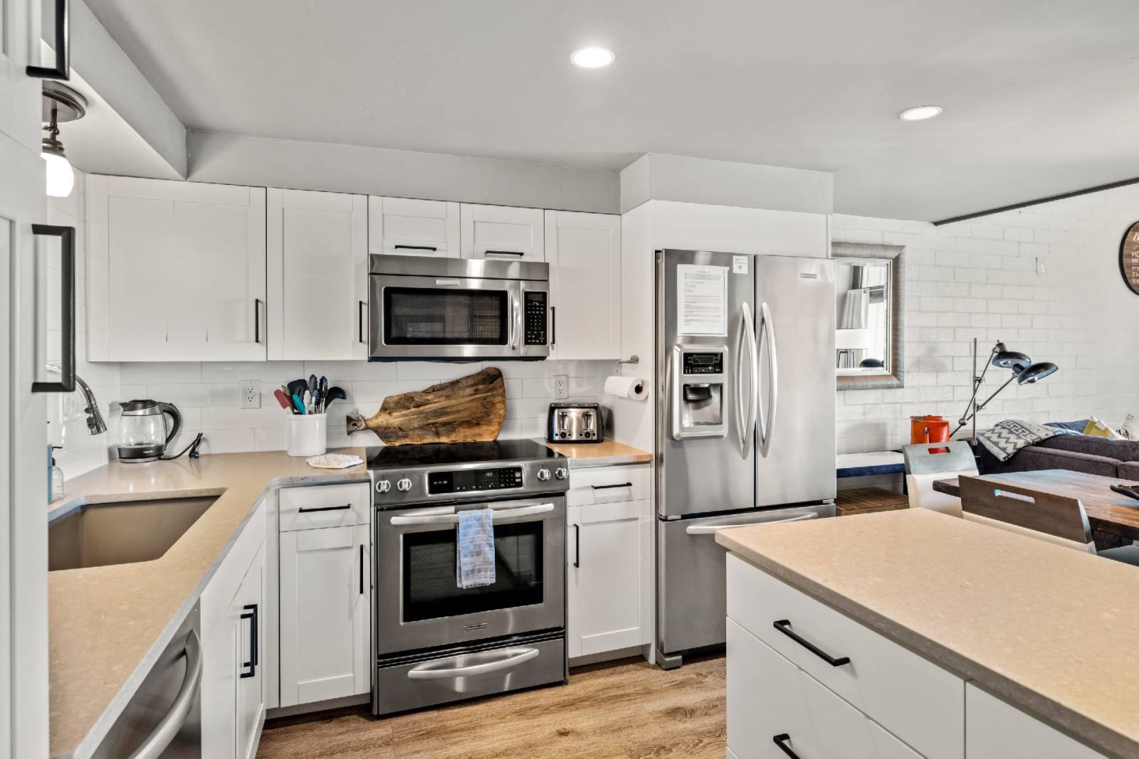 The spectacular kitchen is right off the living area and features Kitchen Aid stainless steel appliances, stunning quartz countertops and has everything needed to stay in and make a meal.
