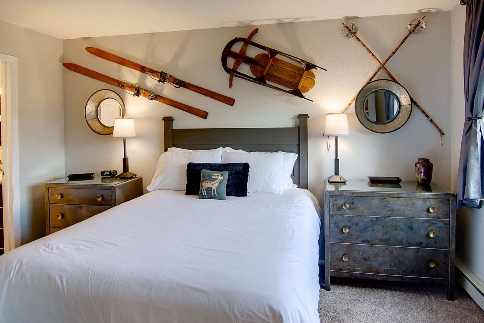 The master bedroom suite features a comfy, queen sized bed and remodeled, full bathroom including a shower and tub.