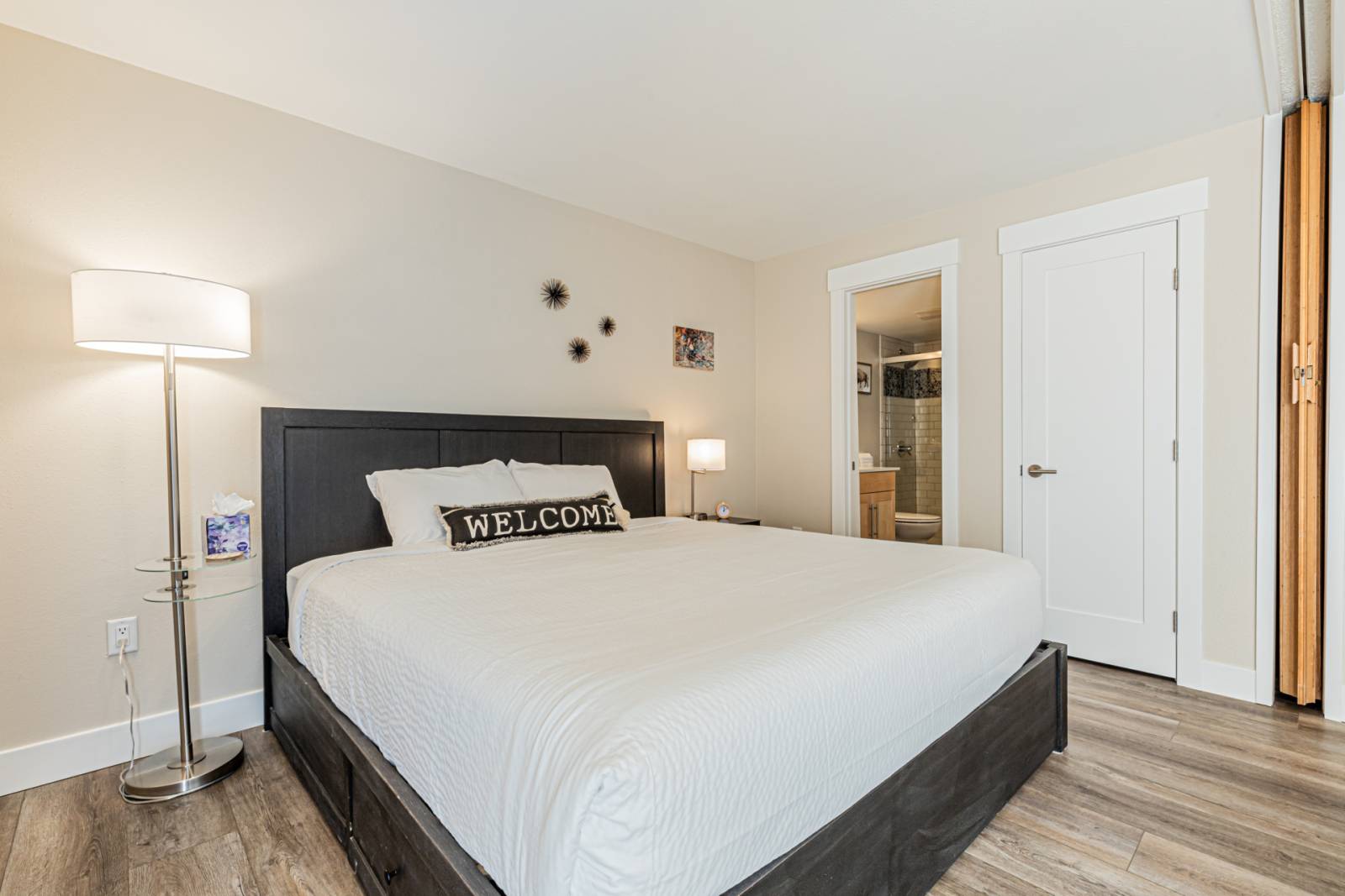 The beautifully updated and remodeled property offers an open living area with comfortable seating on a sofa (pulls out for a 2nd bed) and chairs. Lay in bed and take in the slope views or sit back and relax on the sofa by the gas fireplace and watch movies on the large flat screen TV. Off of the living area is the updated kitchen, featuring gorgeous counter tops, beautiful stainless appliances, wood cabinetry and two counter bar stools. The kitchen is fully equipped with everything you need for cooking a meal. There is a rustic, wood dining table with seating for 4 in the living area, perfect for a family or two couples. There is a an accordion door that can close off the bedroom to separate form the living area/pull out sofa and turn this studio into a 1 bedroom. The updated full bathroom is right off of that area and includes a glass shower.