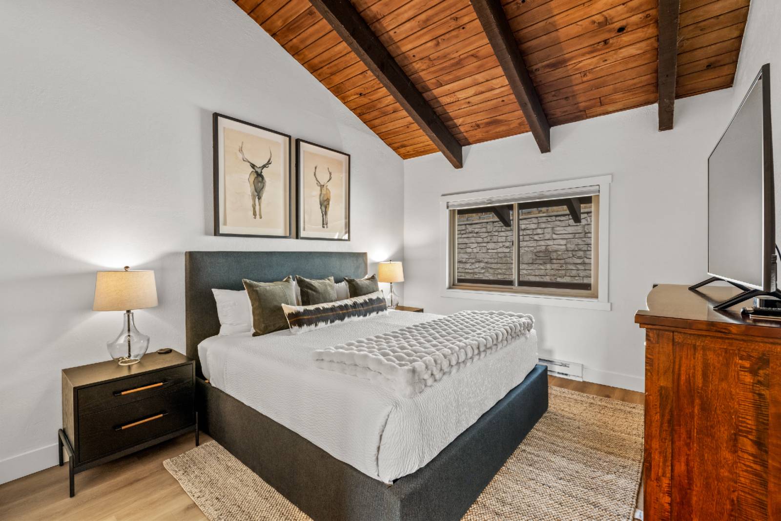 The king en suite has tons features a large flat screen TV, a walk in shower and lots of storage including a dresser and closet.
