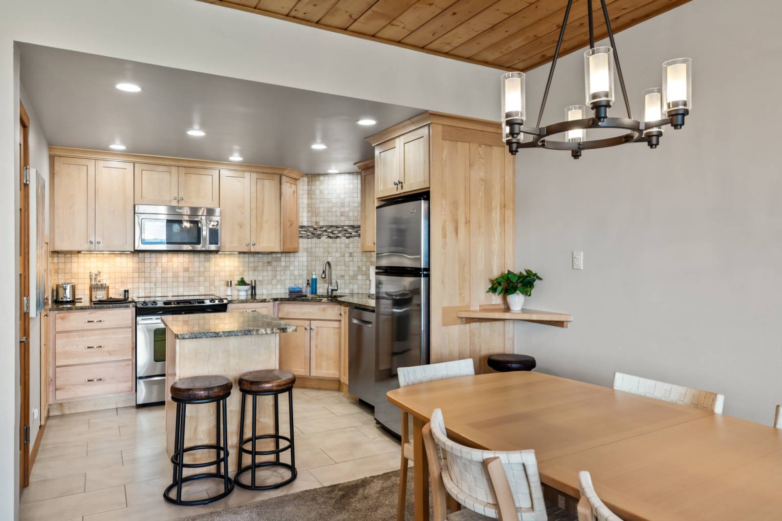 The fully stocked, updated kitchen features gorgeous granite countertops and stainless steel appliances. It has everything you will need to make a meal.