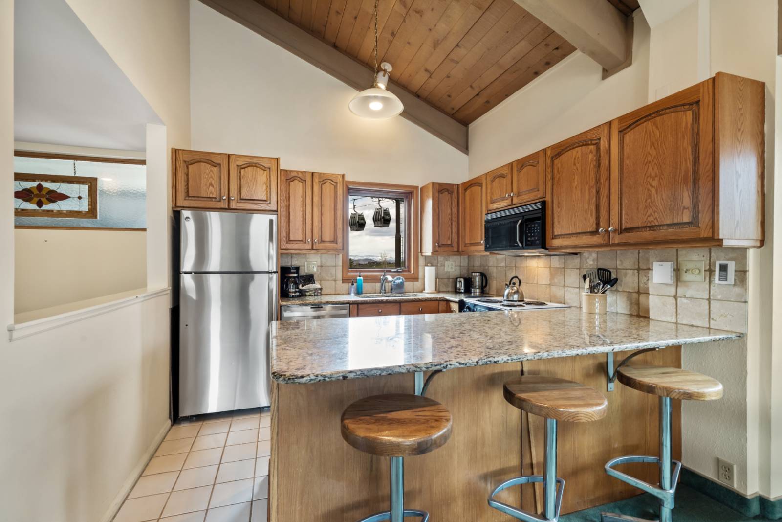 There are plenty of dining options with six chairs for the dining table plus three bar stools at the kitchen counter. There is also a deck that is accessible from the living room, that has both amazing valley as well as slope views.