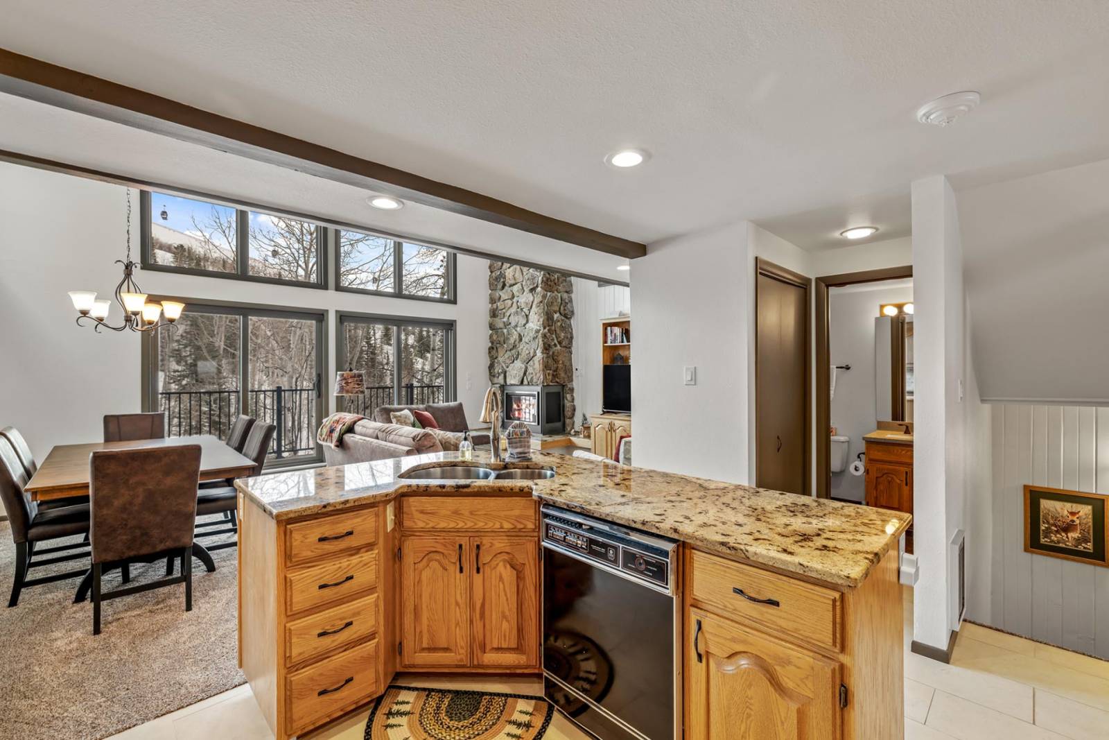Enter the remodeled property on the main level and into the open living area which features floor-to-ceiling windows, incredible slope views and plenty of natural light. It also offers ample comfortable seating on the new sofa. Sit back and relax, gather with friends and family by the electric fireplace, warm up and take in the beautiful scenery and/or watch a game or movie on the big screen TV.