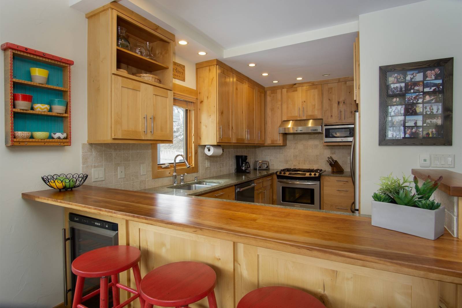Enter the property into a newly remodeled and very large mudroom/entry area with tons of storage space for all of your gear including cubbies, hooks and benches. You are on the main level, which features a spectacularly updated kitchen, boasting new, high-end stainless appliances, including a gas range, mountain-style wood cabinetry and gorgeous granite counters. It is fully equipped with everything you would need for staying in and cooking a meal. There is a dining table off the kitchen, perfect for a family or group, as well as counter seating at the beautiful butcher block bar.