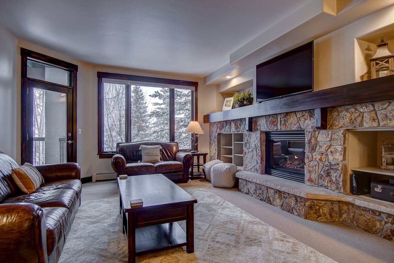 The main level features the spacious living area and includes a lots of natural light, vaulted wood-paneled ceiling, a large dining area and ample comfortable seating. Sit back and relax by the moss rock stone gas fireplace and take in the fantastic views and/or watch a movie or show on the large flat screen TV. Access the deck, which has outdoor seating and an electric bbq grill.