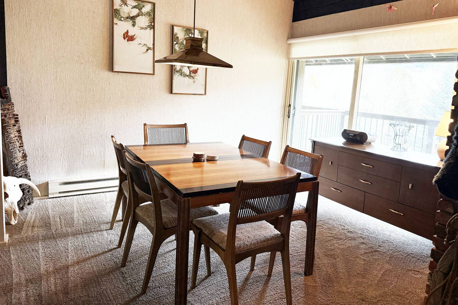 The dining area leads to the covered deck, perfect for taking in the fantastic views with a cocktail after a great day on the mountain.