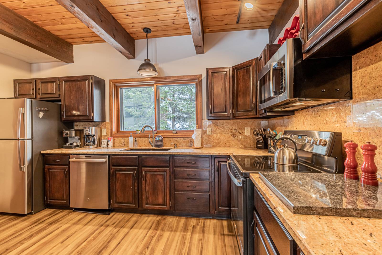 Solid fixtures and furnishings, fabulous flooring, abundant comfortable seating, beautiful tongue and groove wood ceilings and beams highlight the open living area on the main level.