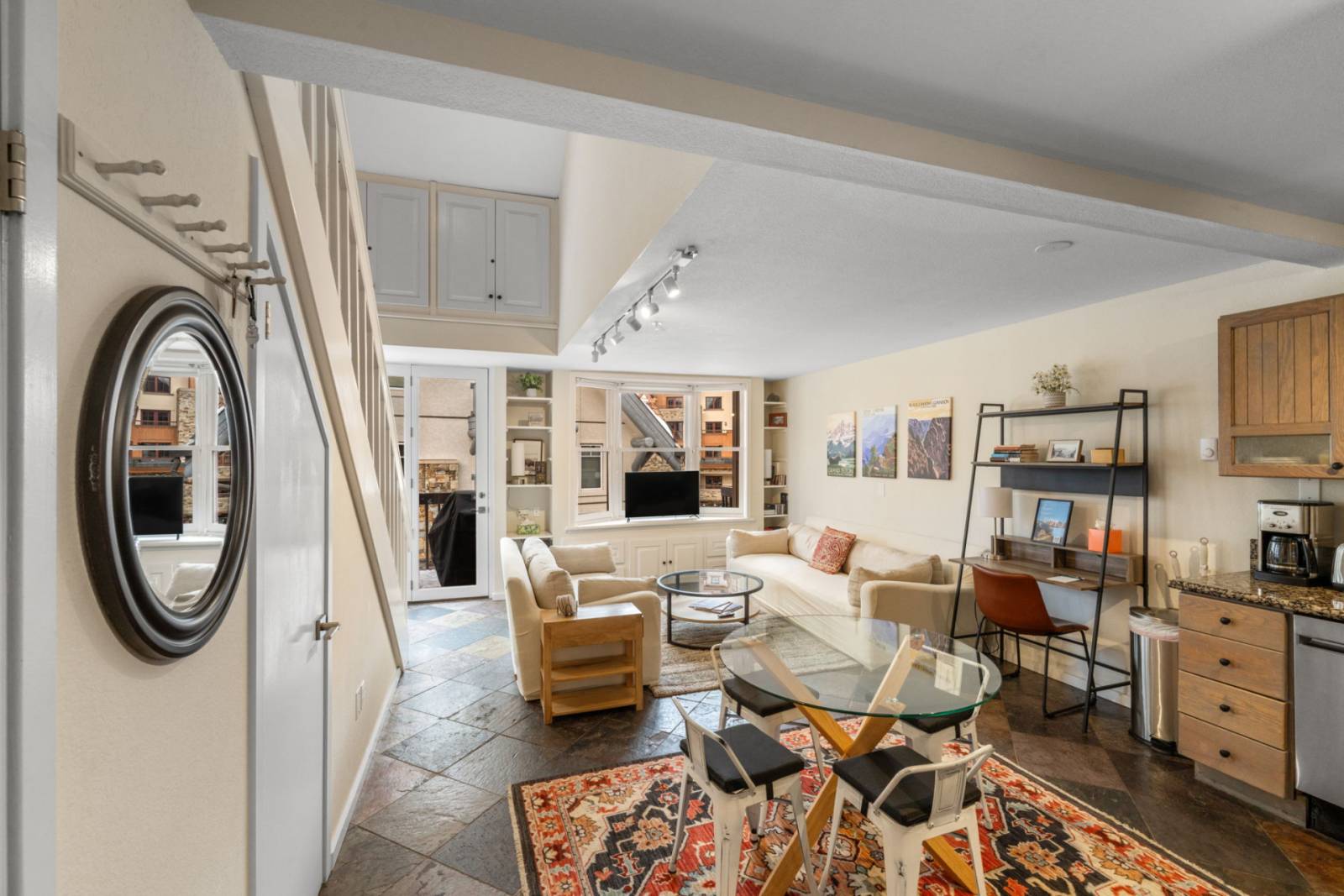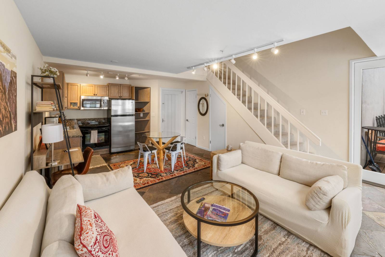 Enjoy the open main level kitchen, living and dining with a powder bath, with the full bath and sleeping quarters upstairs. This condo has one private bedroom with a king bed, an open-air bunk area on the second floor landing and an additional lofted sleeping area with 1 twin and 1 full bed accessed via spiral staircase (heads up, the staircase is narrow). The condo has two decks overlooking the ice-skating rink and Reflection Plaza and offers views to Mt. Wilson. Shared condo laundry room and ski lockers are just a few of the many amenities and touches that this great property offers.