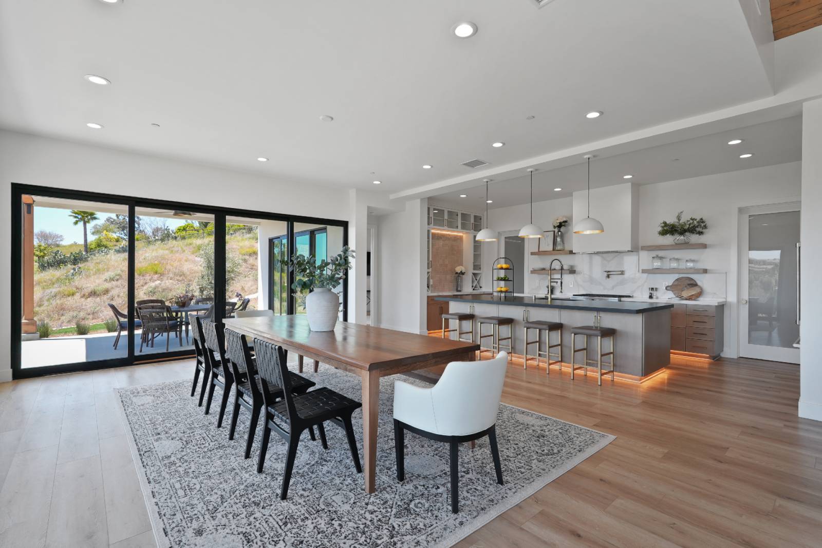 The open floor plan creates the perfect space for gathering with family and friends. The gourmet kitchen is a chef’s paradise, featuring custom cabinetry, a large granite island, and top-of-the-line appliances. Whether you’re preparing a feast or enjoying casual meals, this kitchen has everything you need to inspire your culinary creativity. The dining area, framed by large windows, offers a picturesque spot to enjoy meals while soaking in the beauty of the surrounding vineyards.