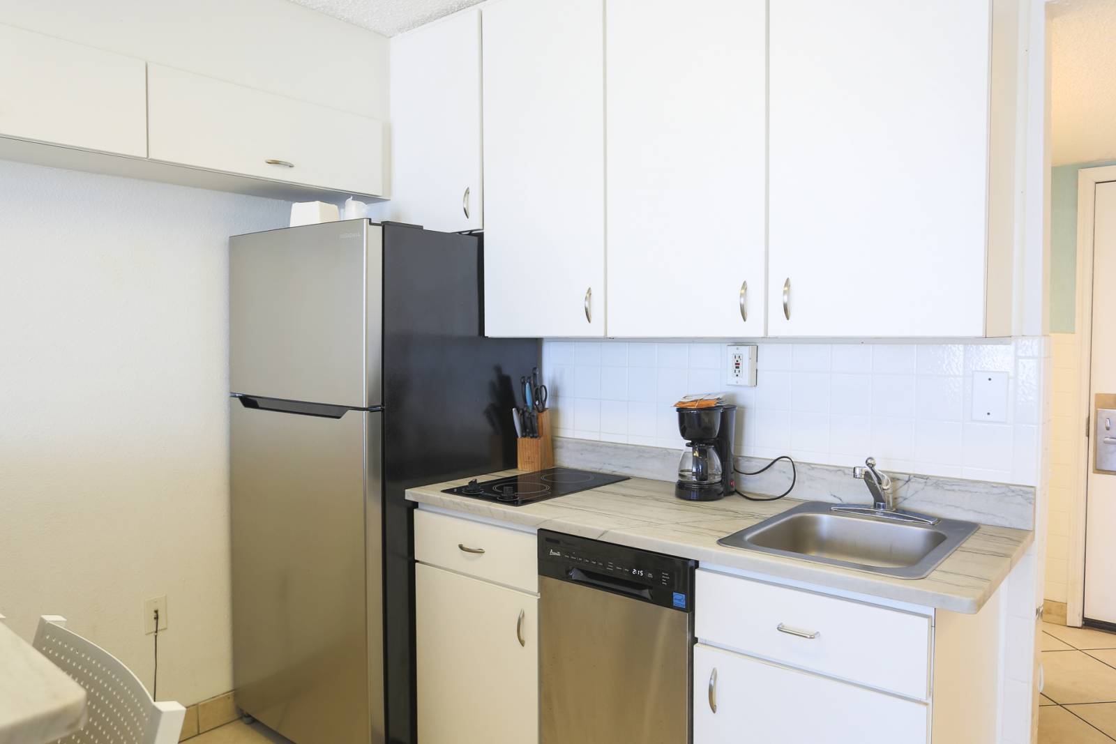 * Kitchenette with quartz counters, smooth-top burner, microwave, and updated appliances