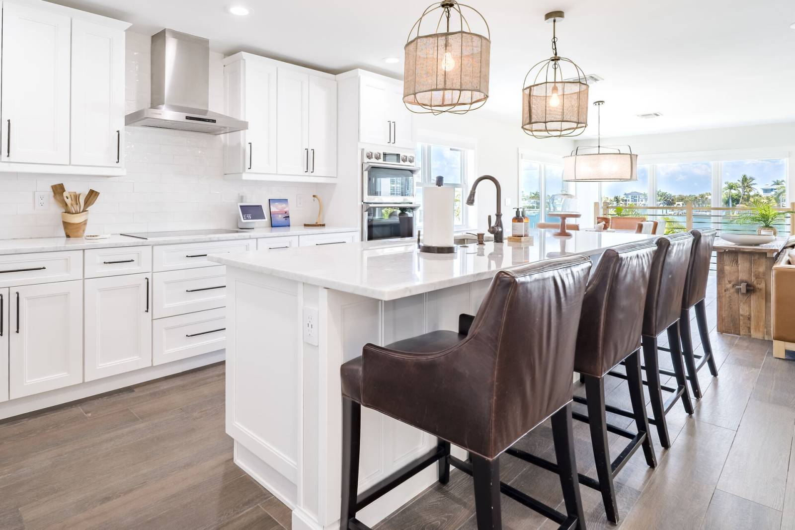 The fully equipped kitchen is designed for both casual and gourmet cooking, featuring expansive countertops, stainless steel appliances, and all the essentials needed to prepare meals at home.