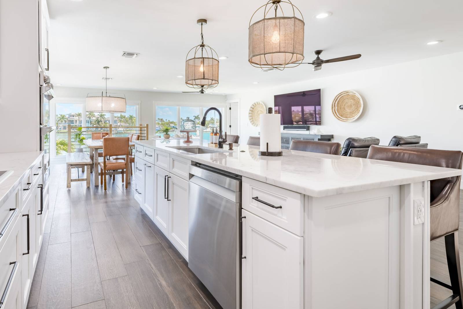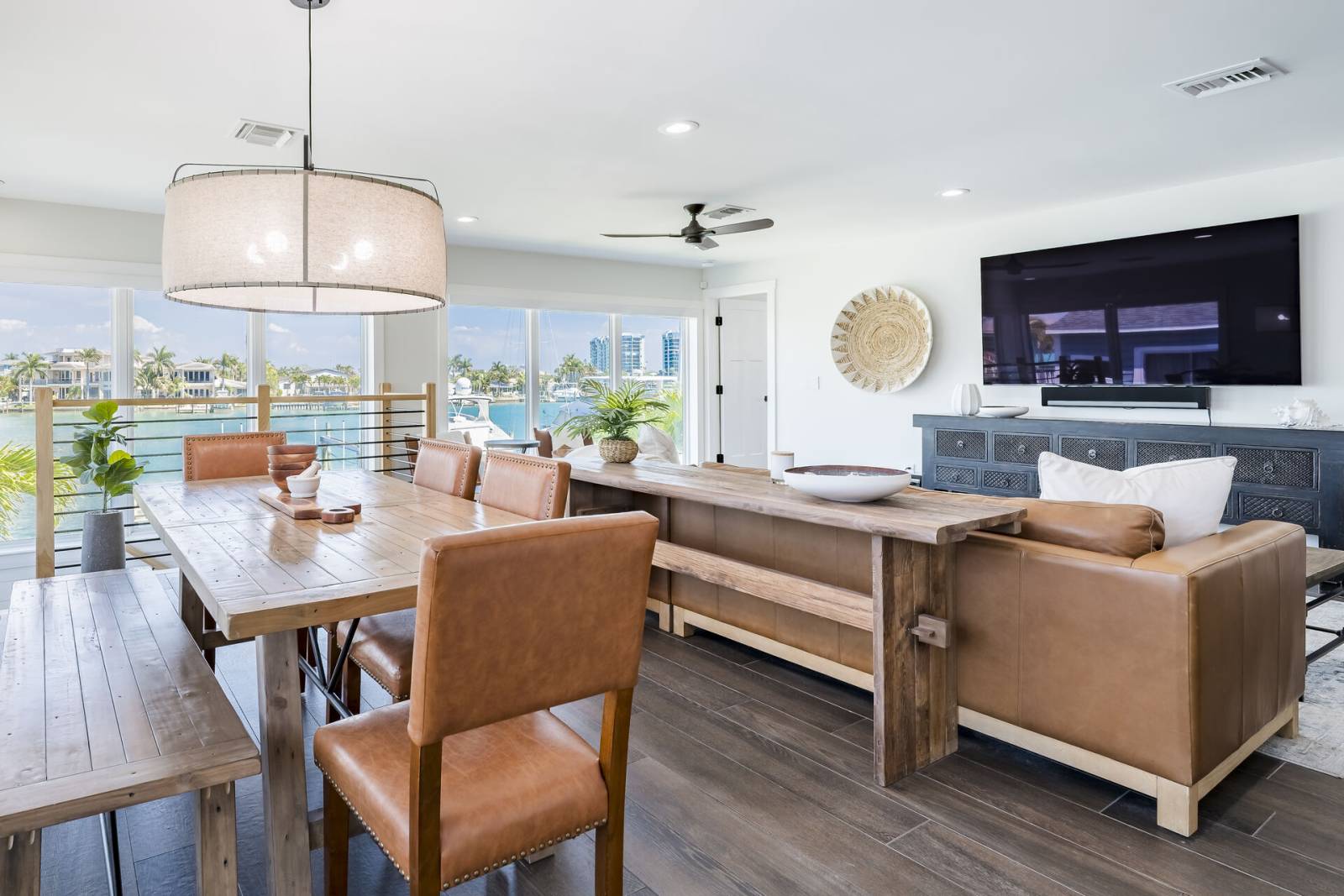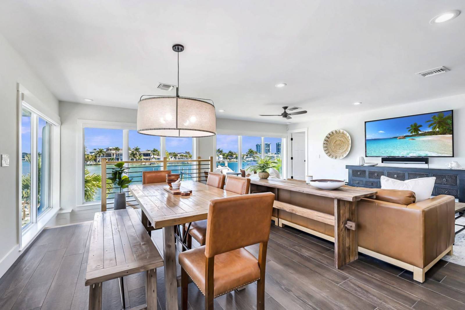 Inside, the home offers an open and inviting living area with plush leather seating and a large flat-screen TV—perfect for unwinding after a day at the beach. The adjacent dining space provides plenty of room for family meals and group gatherings.