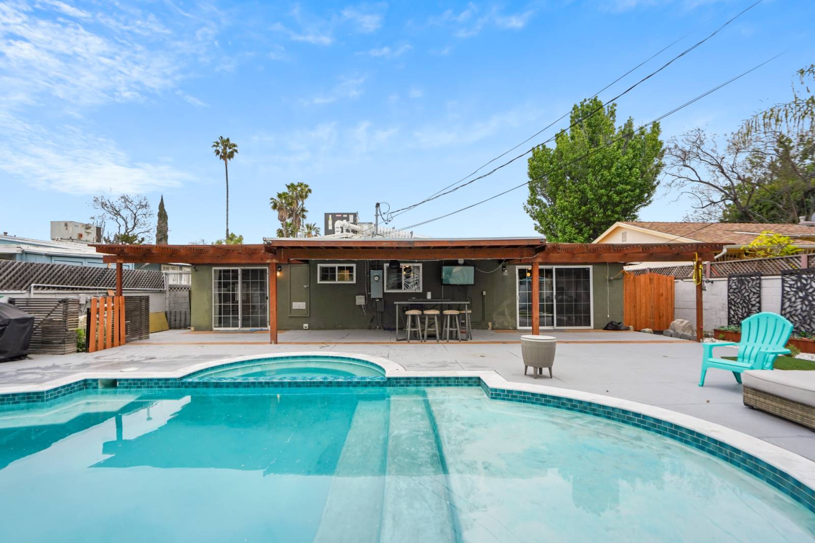 Enjoy California indoor/outdoor living with a private and gated backyard oasis and private pool and jacuzzi spa. Also furnished w outdoor furniture, outdoor TV, pool loungers, BBQ Grill and firepit. 6 miles to Universal Studios, Hollywood Bowl or 10 miles to the Sunset Strip or shopping til you drop on Rodeo Drive or check out celebrity homes in Beverly Hills or Bel Air. Malibu or Santa Monica beach is about a 45 min drive away. Family Pet welcome with our Pet Fee.