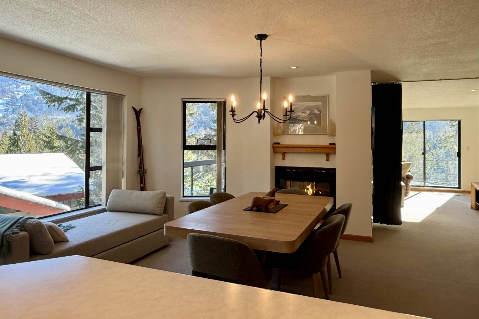 The large living room offers sectional sofa ( queen sofa bed) , Unique velvet curtain can close off Living room to make it a private evening sleeping area, Corner gas fireplace and 60" wall mounted Smart TV provides amble room for family gatherings ... bonus Murphy bed pullout. that can sleep 1-2 guests.